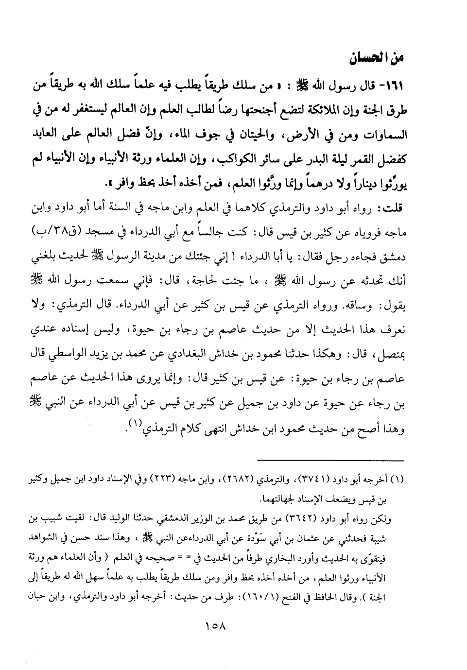 161 - قال رسول الله - صلى الله عليه وسلم -: "من سلك طريقًا يطلب فيه علمًا سلك الله به طريقًا من طرق الجنة وإن الملائكة لتضع أجنحتها رضًا لطالب العلم وإن العالم ليستغفر له من في السماوات ومن في الأرض، والحيتان في جوف الماء، وإنّ فضل العالم على العابد كفضل القمر ليلة البدر على سائر الكواكب، وإن العلماء ورثة الأنبياء وإن الأنبياء لم يورِّثوا دينارًا ولا درهمًا وإنما ورَّثوا العلم، فمن أخذه أخذ بحظ وافر".