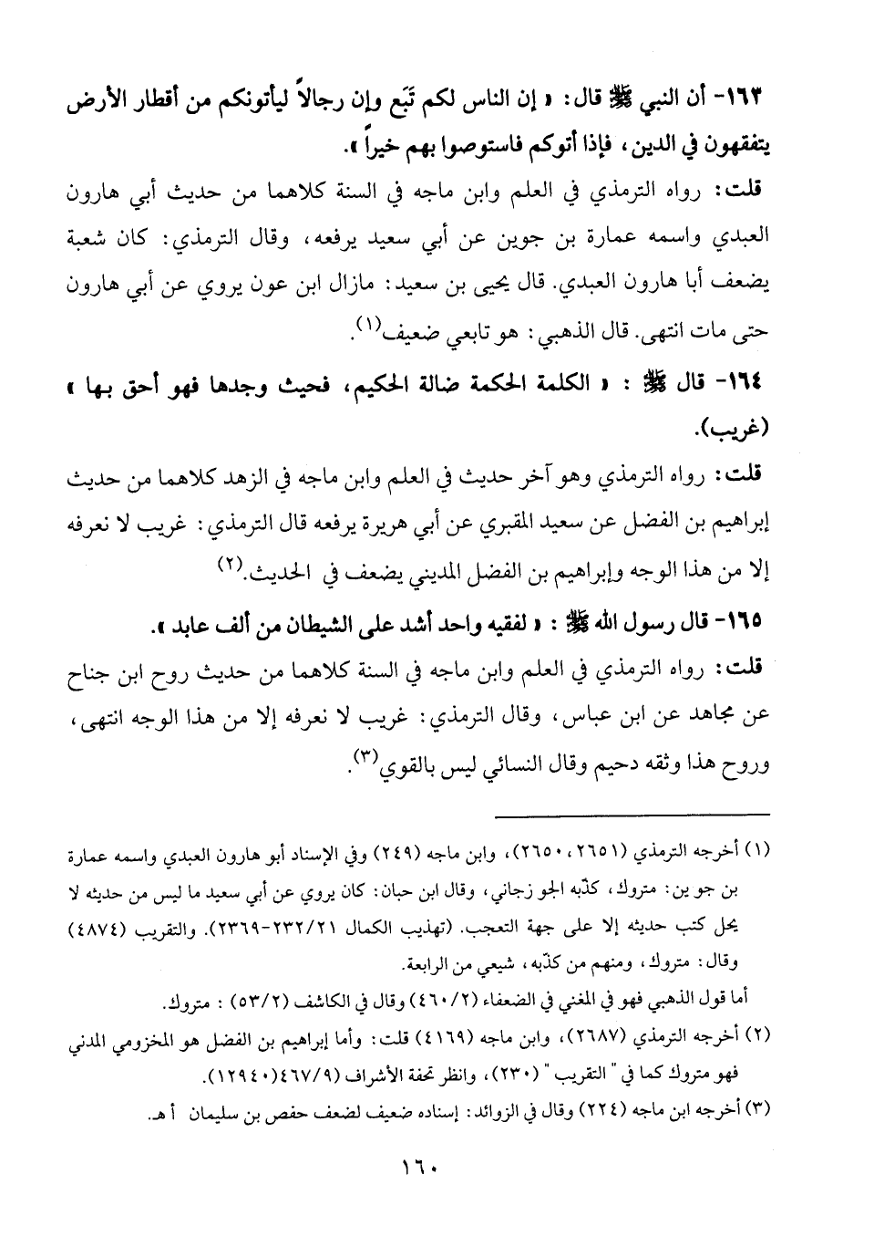 قلت: رواه الترمذي في العلم وابن ماجه في السنة كلاهما من حديث أبي هارون العبدي واسمه عمارة بن جوين عن أبي سعيد يرفعه، وقال الترمذي: كان شعبة يضعف أبا هارون العبدي. قال يحيى بن سعيد: مازال ابن عون يروي عن أبي هارون حتى مات انتهى. قال الذهبي: هو تابعي ضعيف (¬1).
