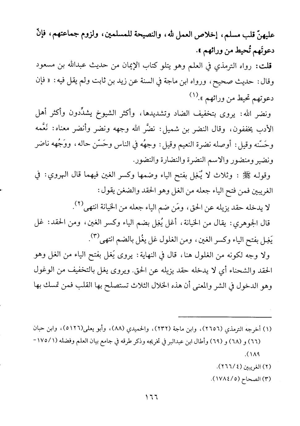 عليهنّ قلب مسلم، إخلاص العمل لله، والنصيحة للمسلمين، ولزوم جماعتهم، فإنّ دعوتَهم تُحيط من ورائهم".