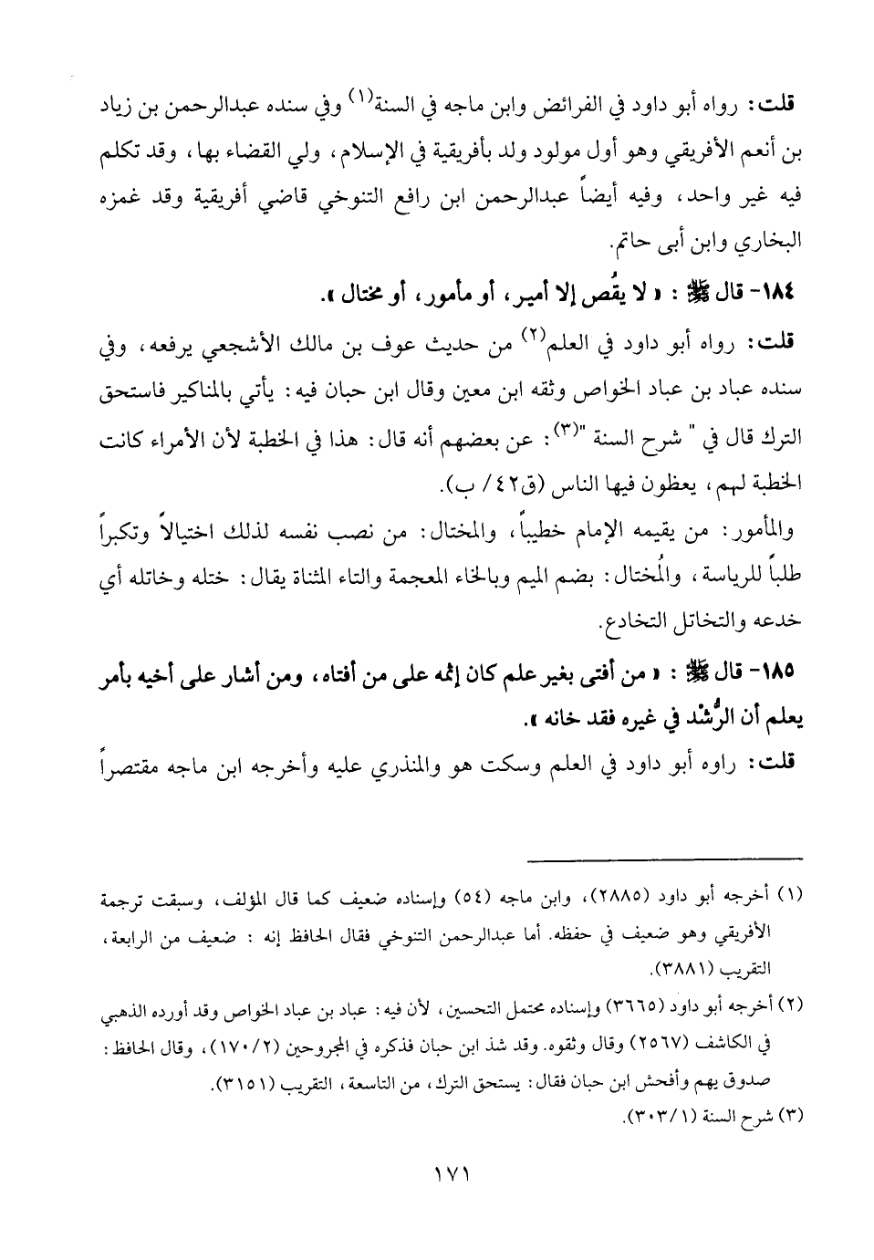 قلت: رواه أبو داود في العلم (¬2) من حديث عوف بن مالك الأشجعي يرفعه، وفي سنده عباد بن عباد الخواص وثقه ابن معين وقال ابن حبان فيه: يأتي بالمناكير فاستحق الترك قال في "شرح السنة" (¬3): عن بعضهم أنه قال: هذا في الخطبة لأن الأمراء كانت الخطبة لهم، يعظون فيها الناس.
