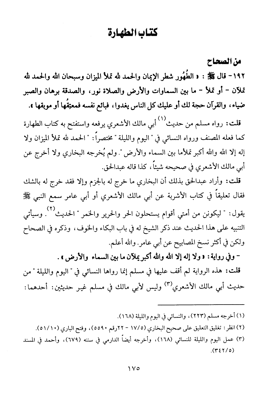 قلت: رواه مسلم من حديث (¬1) أبي مالك الأشعري يرفعه واستفتح به كتاب الطهارة كما فعله المصنف ورواه النسائي في "اليوم والليلة" مختصرًا: "الحمد لله تملأ الميزان ولا إله إلا الله والله أكبر تملأ ما بين السماء والأرض". ولم يُخرجه البخاري ولا أخرج عن أبي مالك الأشعري في صحيحه شيئًا، كذا قاله عبد الحق.