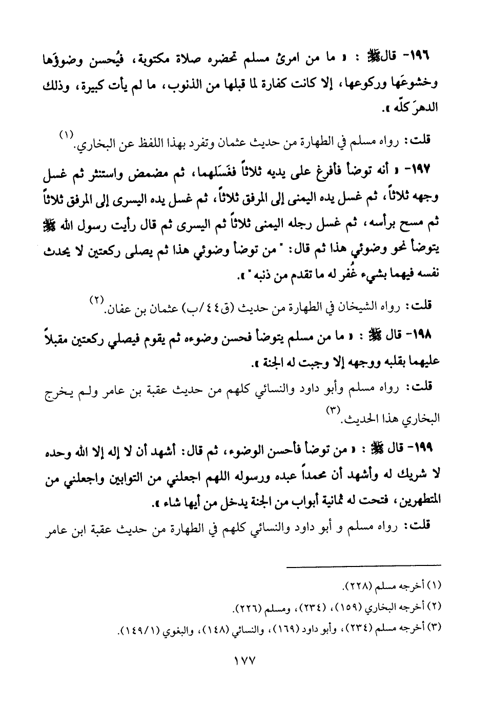 197 - "أنه توضَّأ فأفرغ على يديه ثلاثًا فغَسَلهما، ثم مضمض واستنثر ثم غسل وجهه ثلاثًا، ثم غسل يده اليمنى إلى المرفق ثلاثًا، ثم غسل يده اليسرى إلى المرفق ثلاثًا ثم مسح برأسه، ثم غسل رجله اليمنى ثلاثًا ثم اليسرى ثم قال رأيت رسول الله - صلى الله عليه وسلم - يتوضأ نحو وضوئي هذا ثم قال: "من توضَّأ وضوئي هذا ثم يصلي ركعتين لا يحدث نفسه فيهما بشيء غُفر له ما تقدم من ذنبه".