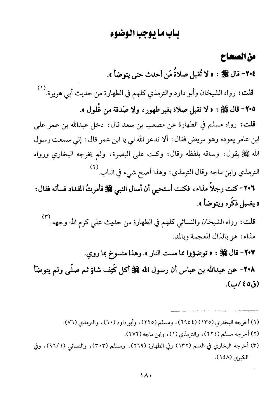 207 - قال - صلى الله عليه وسلم -:"توضؤوا مما مست النار". وهذا منسوخ بما روي.