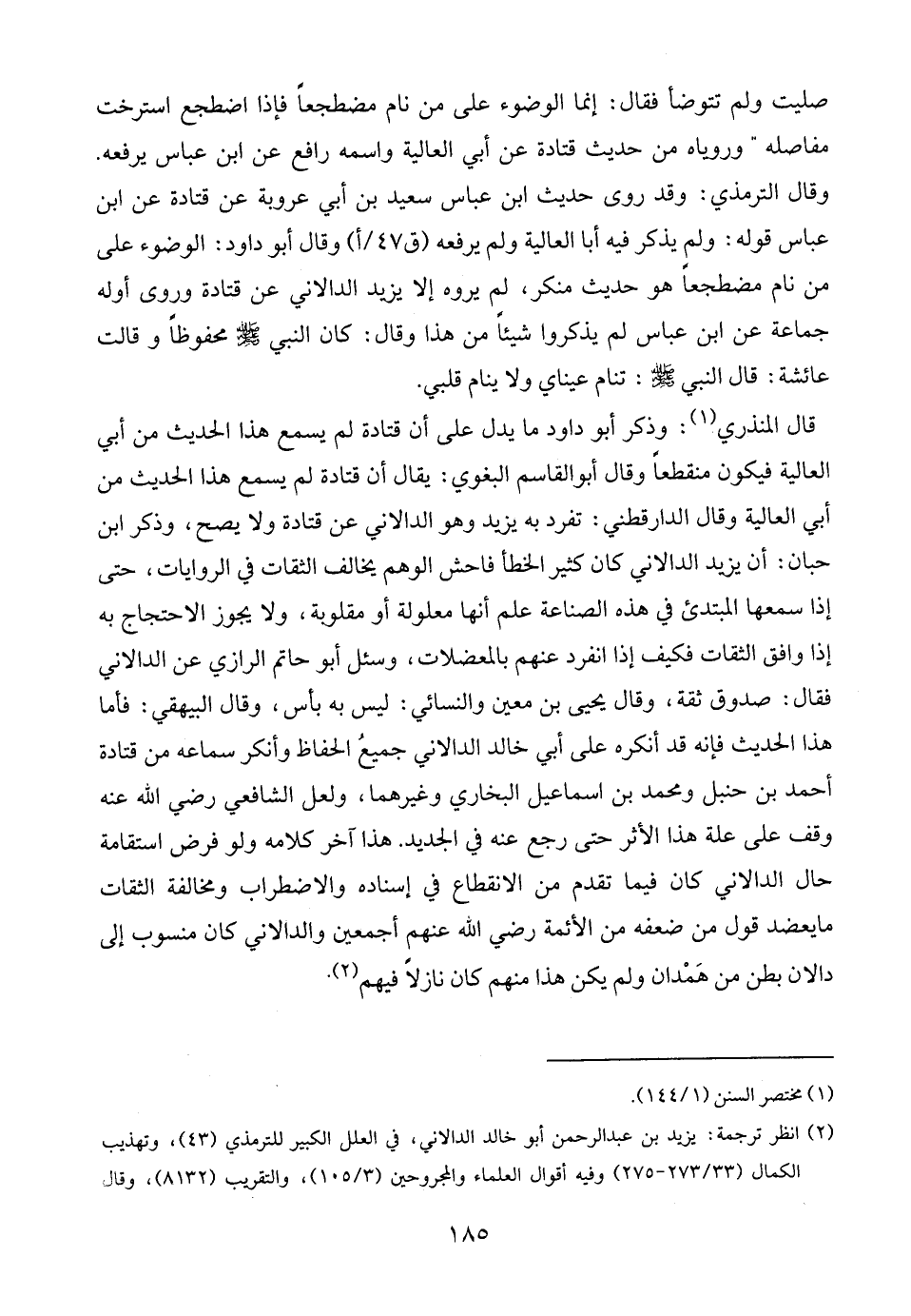 وقال الترمذي: وقد روى حديث ابن عباس سعيد بن أبي عروبة عن قتادة عن ابن عباس قوله: ولم يذكر فيه أبا العالية ولم يرفعه وقال أبو داود: الوضوء على من نام مضطجعًا هو حديث منكر، لم يروه إلا يزيد الدالاني عن قتادة وروى أوله جماعة عن ابن عباس لم يذكروا شيئًا من هذا وقال: كان النبي - صلى الله عليه وسلم - محفوظًا وقالت عائشة: قال النبي - صلى الله عليه وسلم -: تنام عيناي ولا ينام قلبي.