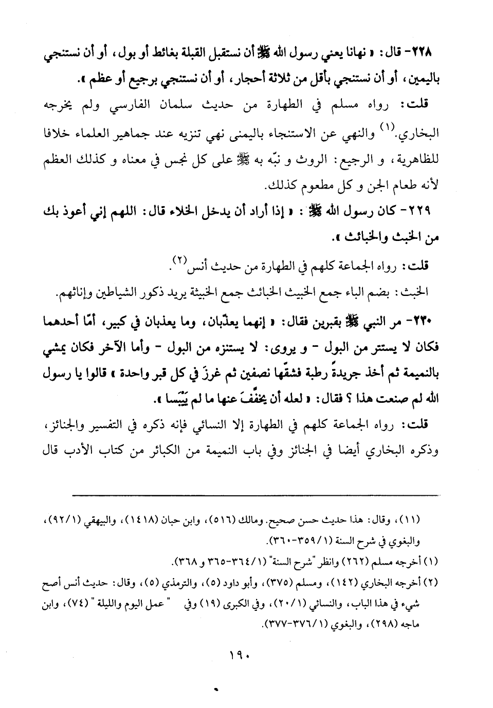 228 - قال: "نهانا يعني رسول الله - صلى الله عليه وسلم - أن نستقبل القبلة بغائط أو بول، أو أن نستنجي باليمين، أو أن نستنجي بأقل من ثلاثة أحجار، أو أن نستنجي برجيع أو عظم".