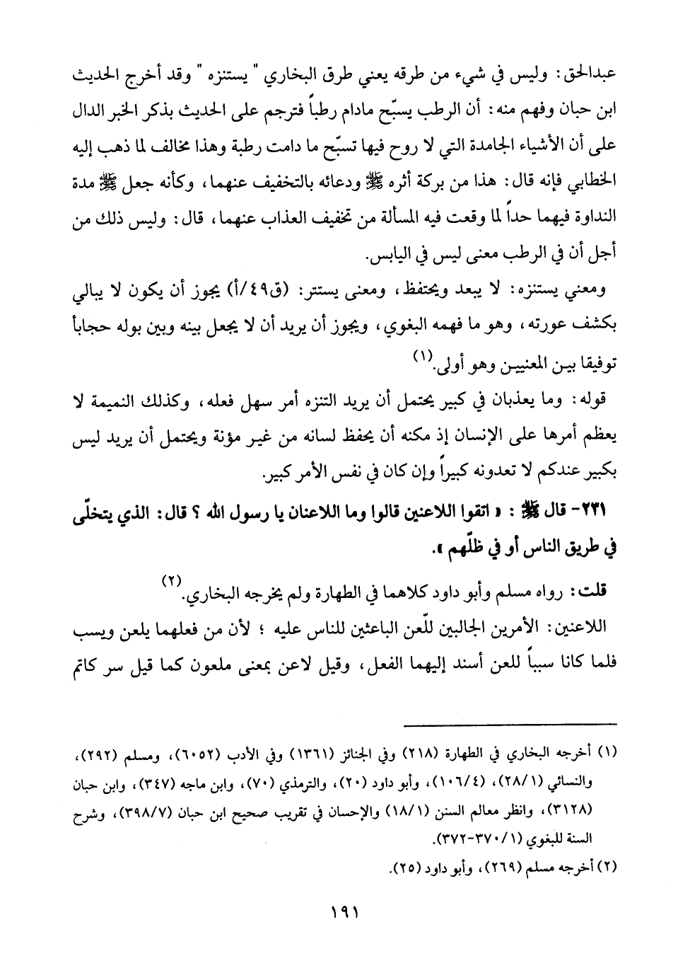 (¬1) أخرجه البخاري في الطهارة (218) وفي الجنائز (1361) وفي الأدب (6052)، ومسلم (292)، والنسائي (1/ 28)، (4/ 106)، وأبو داود (20)، والترمذي (70)، وابن ماجه (347)، وابن حبان (3128)، وانظر معالم السنن (1/ 18) والإحسان في تقريب صحيح ابن حبان (7/ 398)، وشرح السنة للبغوي (1/ 370 - 372).