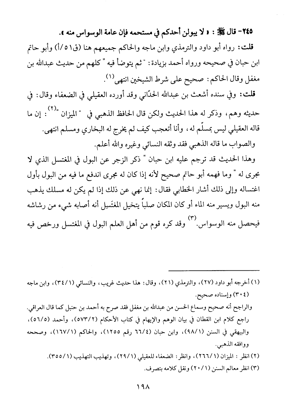 قلت: رواه أبو راود والترمذي وابن ماجه والحاكم جميعهم هنا وأبو حاتم ابن حبان صحيحه ورواه أحمد بزيادة: "ثم يتوضأ فيه" كلهم من حديث عبد الله بن مغفل وقال الحاكم: صحيح على شرط الشيخين انتهى (¬1).