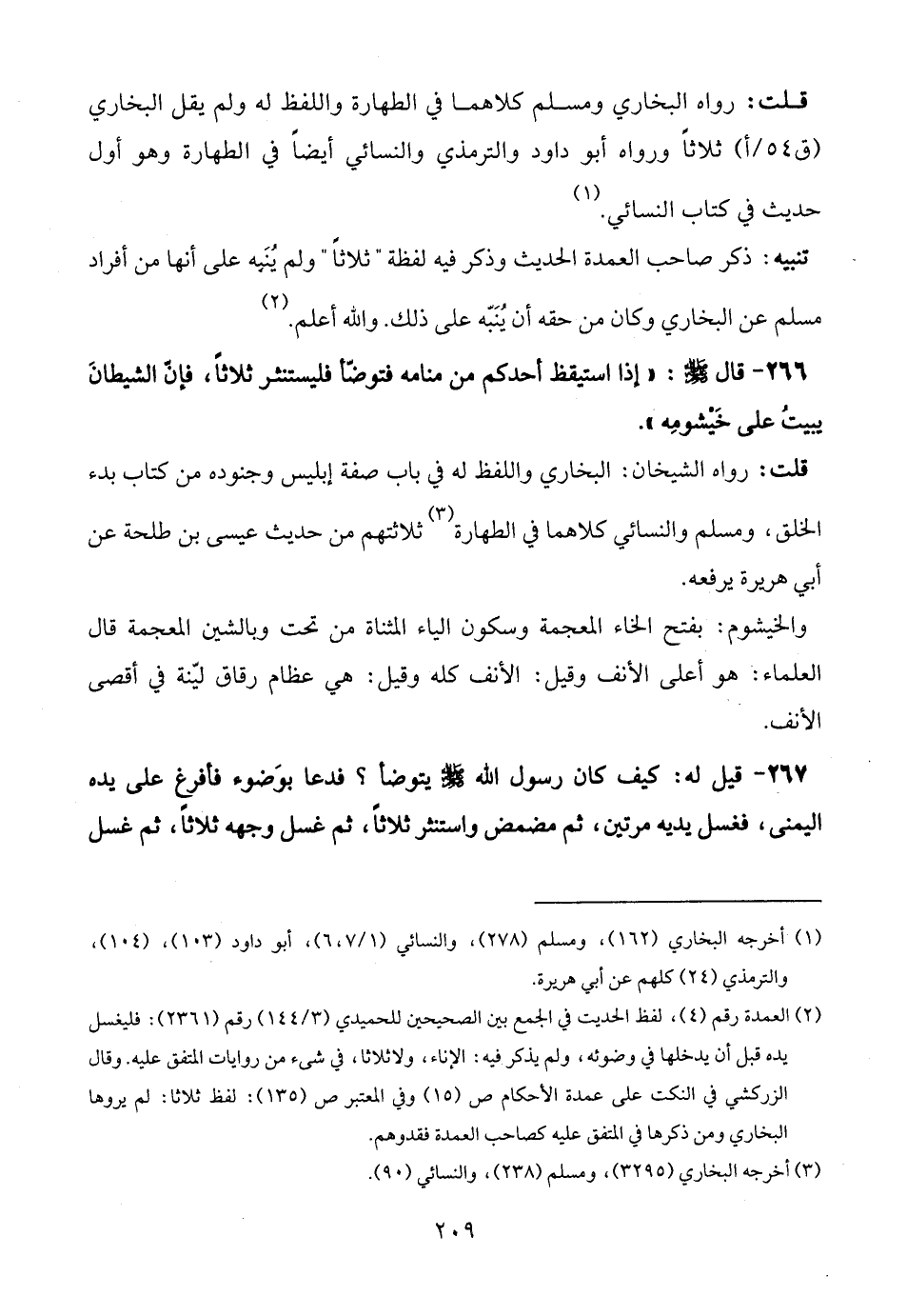 (¬2) العمدة رقم (4)، لفظ الحديث في الجمع بين الصحيحين للحميدي (3/ 144) رقم (2361): فليغسل يده قبل أن يدخلها في وضوئه، ولم يذكر فيه: الإناء، ولا ثلاثا، في شيء من روايات المتفق عليه. وقال الزركشي في النكت على عمدة الأحكام ص (15) وفي المعتبر ص (135): لفظ ثلاثا: لم يروها البخاري ومن ذكرها في المتفق عليه كصاحب العمدة فقدوهم.