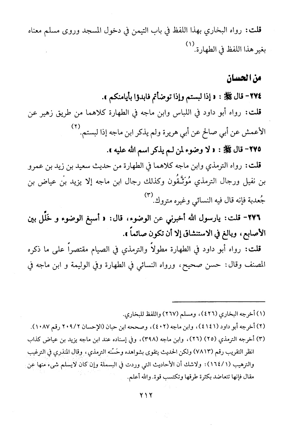 275 - قال - صلى الله عليه وسلم -: "لا وضوء لمن لم يذكر اسم الله عليه".