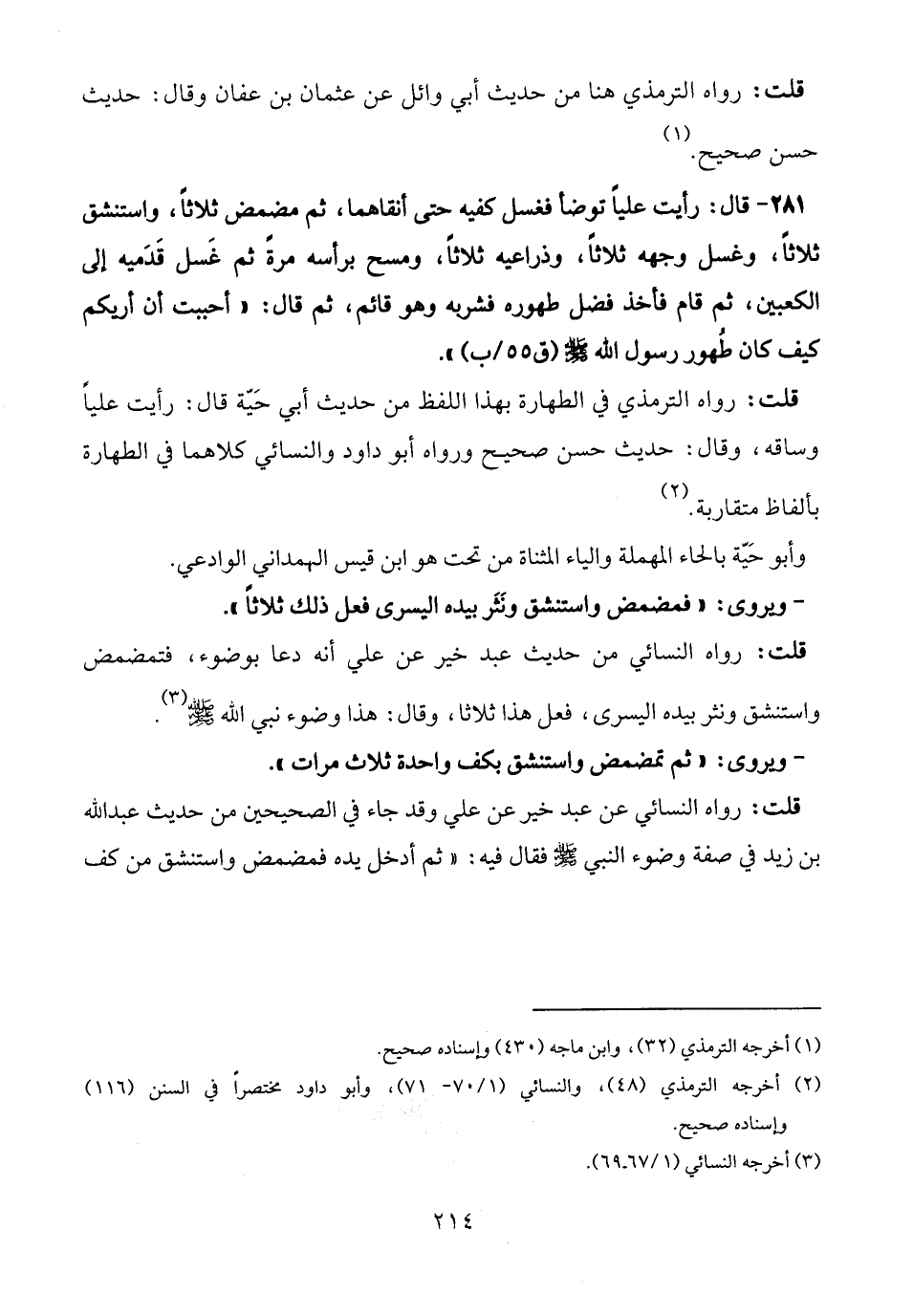 قلت: رواه الترمذي في الطهارة بهذا اللفظ من حديث أبي حَيّة قال: رأيت عليًّا وساقه, وقال: حديث حسن صحيح ورواه أبو داود والنسائي كلاهما في الطهارة بألفاظ متقاربة. (¬2)