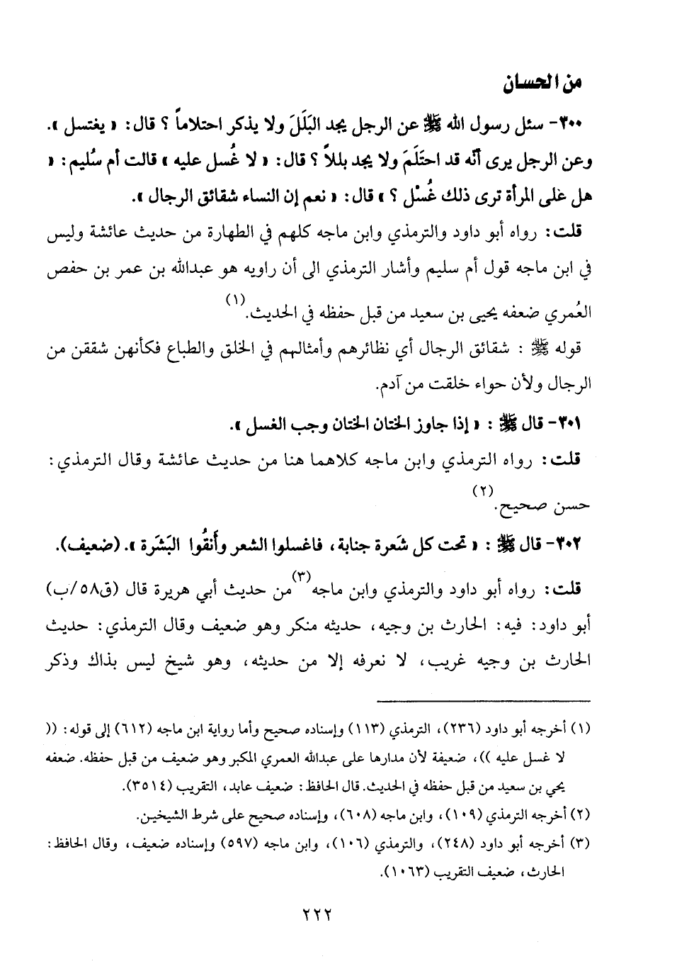 300 - سئل رسول الله - صلى الله عليه وسلم - عن الرجل يجد البَلَلَ ولا يذكر احتلامًا؟ قال: "يغتسل". وعن الرجل يرى أنّه قد احتَلَمَ ولا يجد بللًا؟ قال: "لا غُسل عليه" قالت أم سُليم: "هل على المرأة ترى ذلك غُسْل؟ " قال: "نعم أَنْ النساء شقائق الرجال".