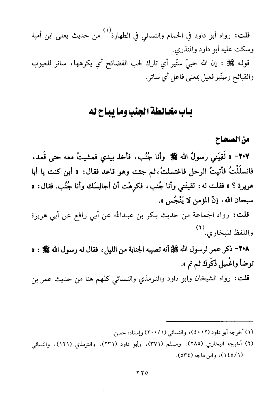 307 - " لَقِيَني رسولُ الله - صلى الله عليه وسلم - وأنا جُنُب، فأخذ بيدي فمشيتُ معه حتى قَعد، فانسلَلْتُ فأتيتُ الرحل فاغتسلتُ، ثم جئت وهو قاعد ففال: "أين كنت يا أبا هريرة؟ " فقلت له: لقيتَني وأنا جُنب، فكرِهْت أن أجالِسَك وأنا جُنُب. فقال: "سبحان الله، إن المؤمن لا يَنْجُس".