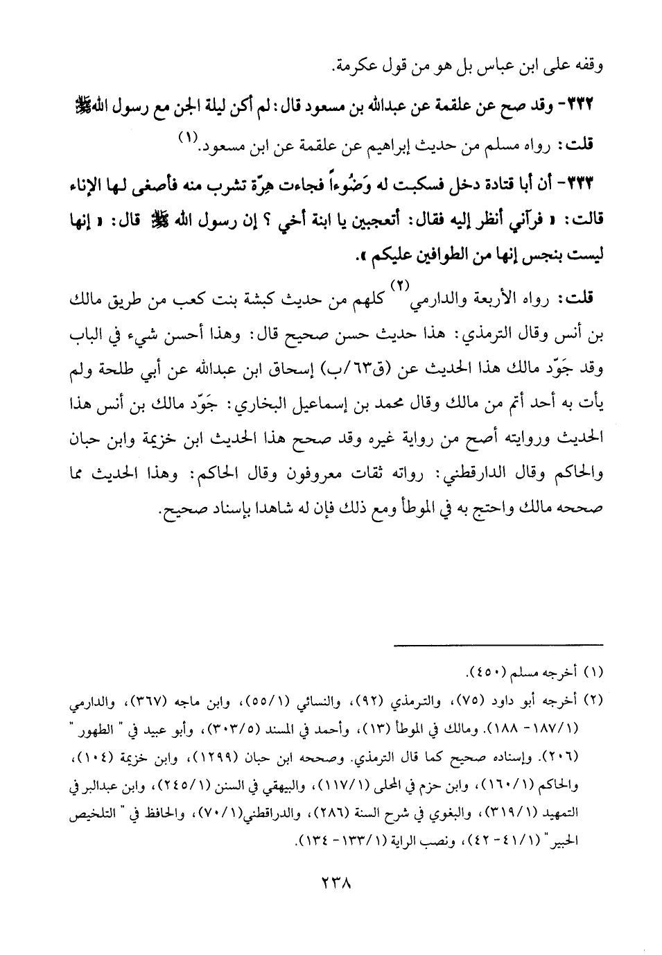 333 - أن أبا قتادة دخل فسكبت له وَضُوءًا فجاءت هِرّة تشرب منه فأصغى لها الإناء قالت: "فرآني أنظر إليه فقال: أتعجبين يا ابنة أخي؟ إن رسول الله - صلى الله عليه وسلم - قال: "إنها ليست بنجس إنها من الطوافين عليكم".