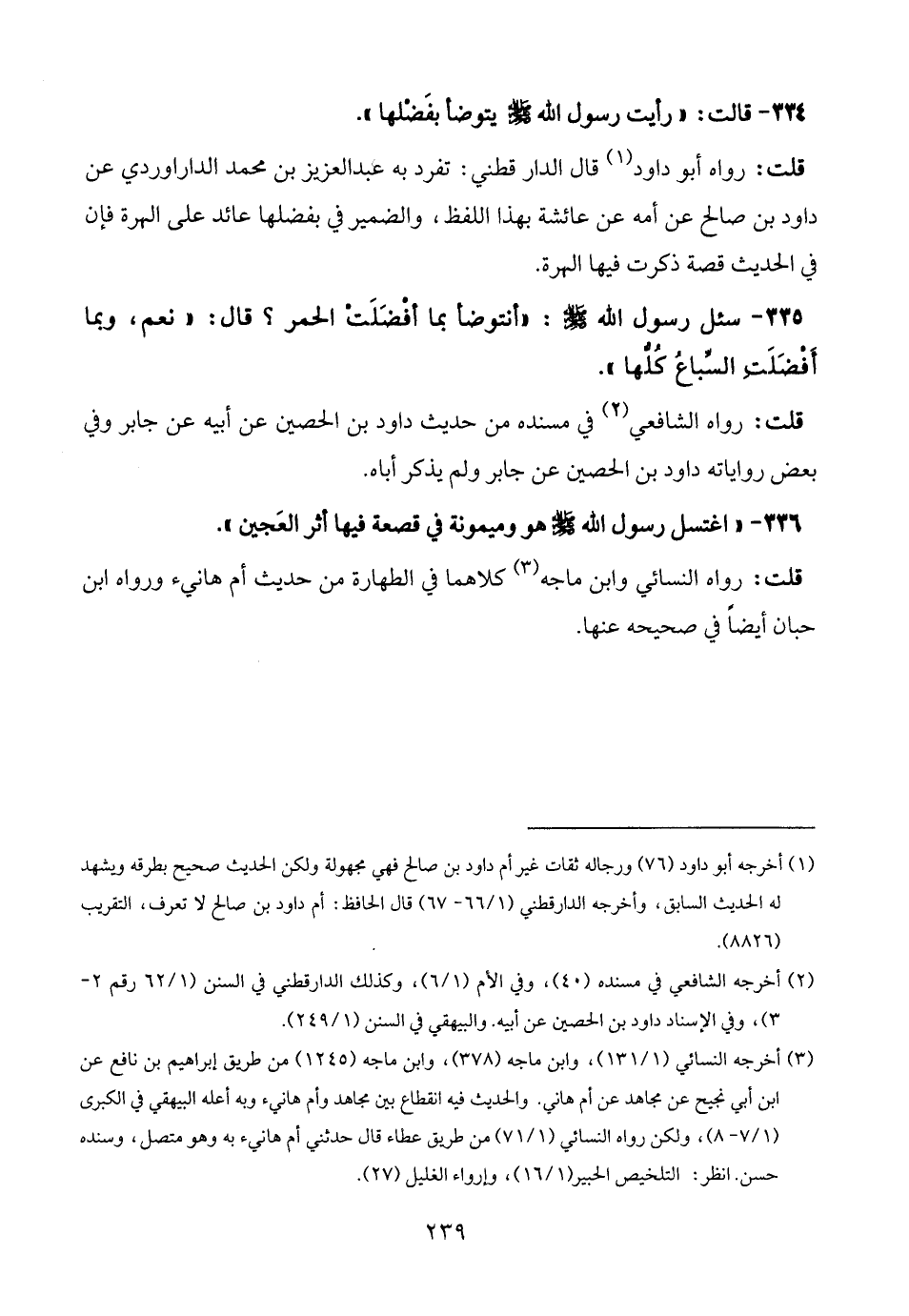 (¬3) أخرجه النسائي (1/ 131)، وابن ماجه (378)، وابن ماجه (1245) من طريق إبراهيم بن نافع عن ابن أبي نجيح عن مجاهد عن أم هاني. والحديث فيه انقطاع بين مجاهد وأم هانيء وبه أعله البيهقي في الكبرى (1/ 7 - 8)، ولكن رواه النسائي (1/ 71) من طريق عطاء قال حدثني أم هانيء به وهو متصل، وسنده حسن. انظر: التلخيص الحبير (1/ 16)، وإرواء الغليل (27).