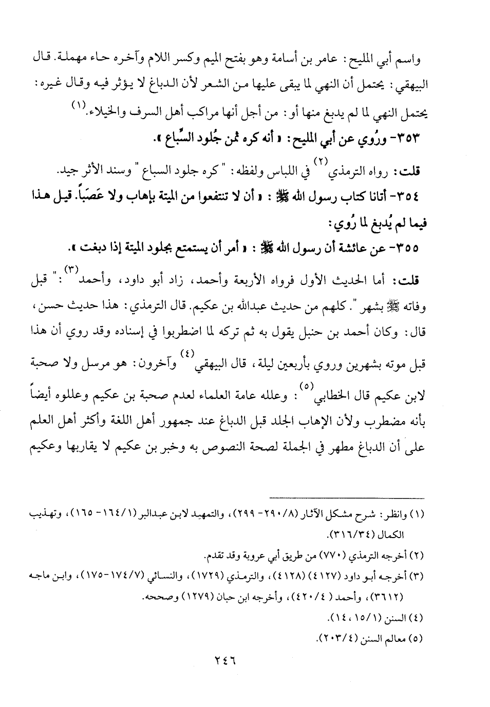 354 - أتانا كتاب رسول الله - صلى الله عليه وسلم -:"أن لا تنتفعوا من الميتة بإهاب ولا عَصَبًا. قيل هذا فيما لم يُدبغ لما رُوي: