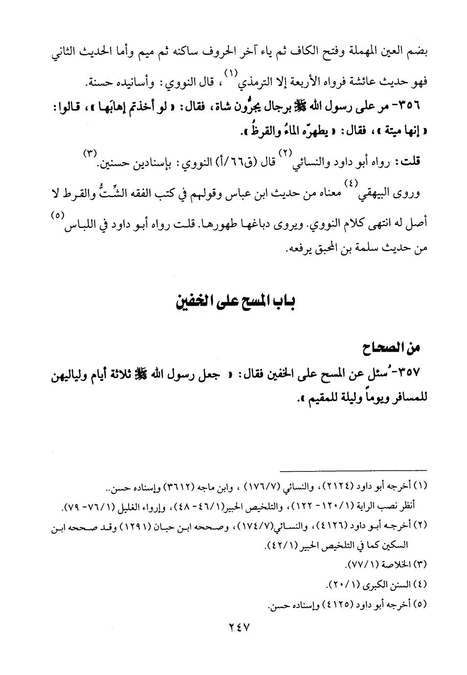 356 - مر على رسول الله - صلى الله عليه وسلم - برجال يجرُّون شاة، فقال: "لو أخذتم إهابَها"، قالوا: "إنها ميتة"، فقال: "يطهرّه الماءُ والقرظُ".