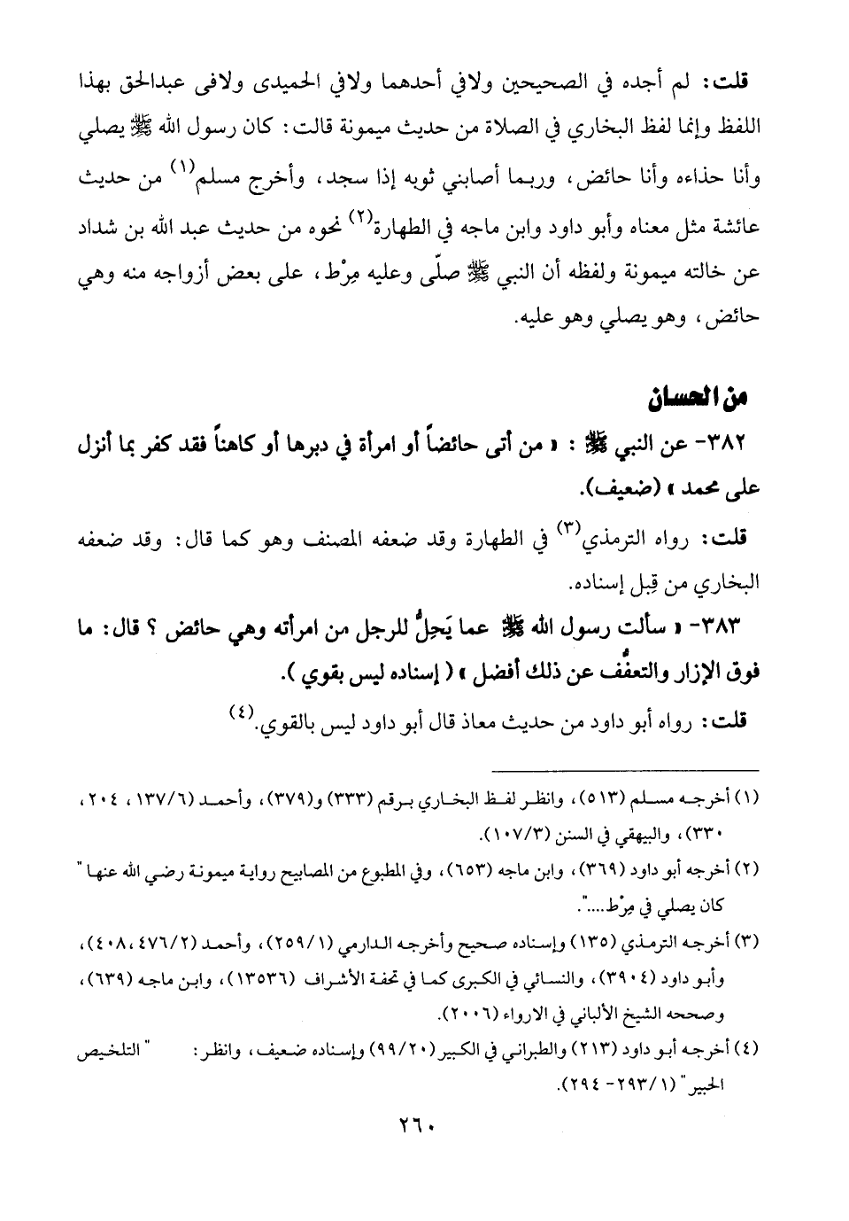 383 - "سألت رسول الله - صلى الله عليه وسلم - عما يَحِلُّ للرجل من امرأته وهي حائض؟ قال: ما فوق الإزار والتعفُّف عن ذلك أفضل" (إسناده ليس بقوي).