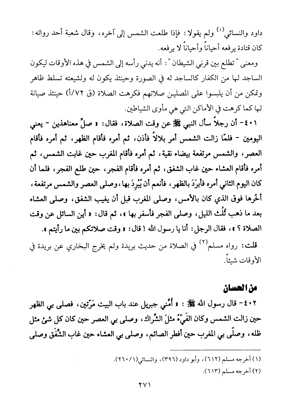 402 - قال رسول الله - صلى الله عليه وسلم -: "أَمَّني جبريل عند باب البيت مَرّتين، فصلى بي الظهر حين زالت الشمس وكان الفَيْءُ مثلَ الشِّراك، وصلى بي العصر حين كان كل شيء مثل ظله، وصلى بي المغرب حين أفطر الصائم، وصلى بي العشاء حين غاب الشَّفَق وصلى