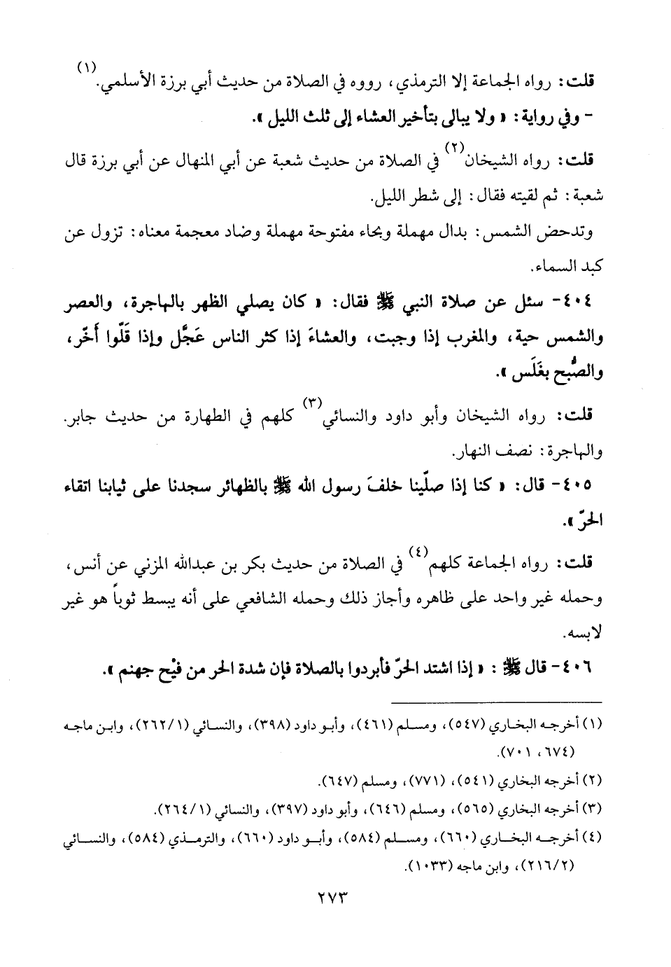 405 - قال: "كنا إذا صلّينا خلفَ رسول الله - صلى الله عليه وسلم - بالظهائر سجدنا على ثيابنا اتقاء الحرّ".