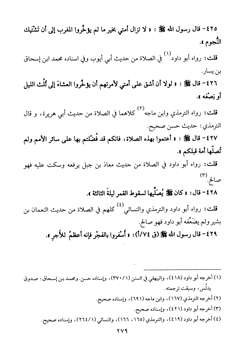 429 - قال رسول الله - صلى الله عليه وسلم -: "أسْفروا بالفجْر فإنه أعظمُ للأَجرِ".