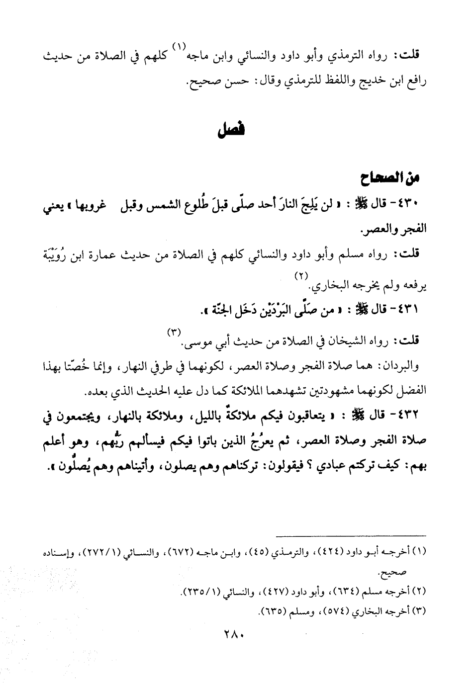 430 - قال - صلى الله عليه وسلم -: "لن يلِجَ النارَ أحد صلّى قبلَ طُلوع الشمس وقبل غروبها" يعني الفجر والعصر.