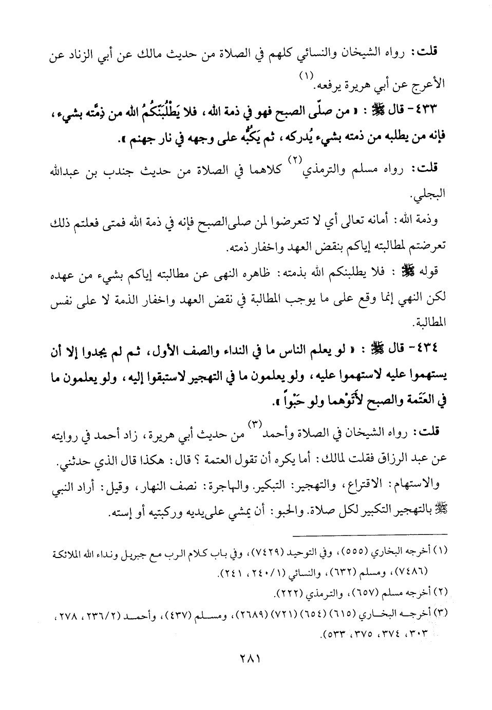 433 - قال - صلى الله عليه وسلم -: "من صلّى الصبح فهو في ذمة الله، فلا يَطْلُبَنّكُمُ الله من ذِمَّته بشيء، فإنه من يطلبه من ذمته بشيء يُدركه، ثم يَكُبُّه على وجهه في نار جهنم".
