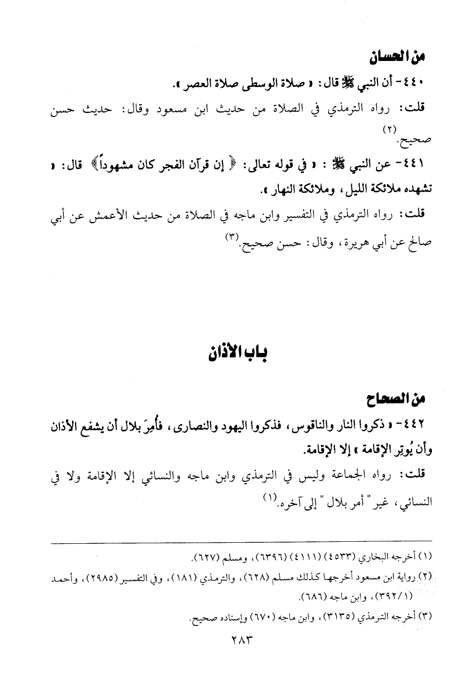 441 - عن النبي - صلى الله عليه وسلم -: "في قوله تعالى: {إِنَّ قُرْآنَ الْفَجْرِ كَانَ مَشْهُودًا (78)} قال: "تشهده ملائكة الليل، وملائكة النهار".