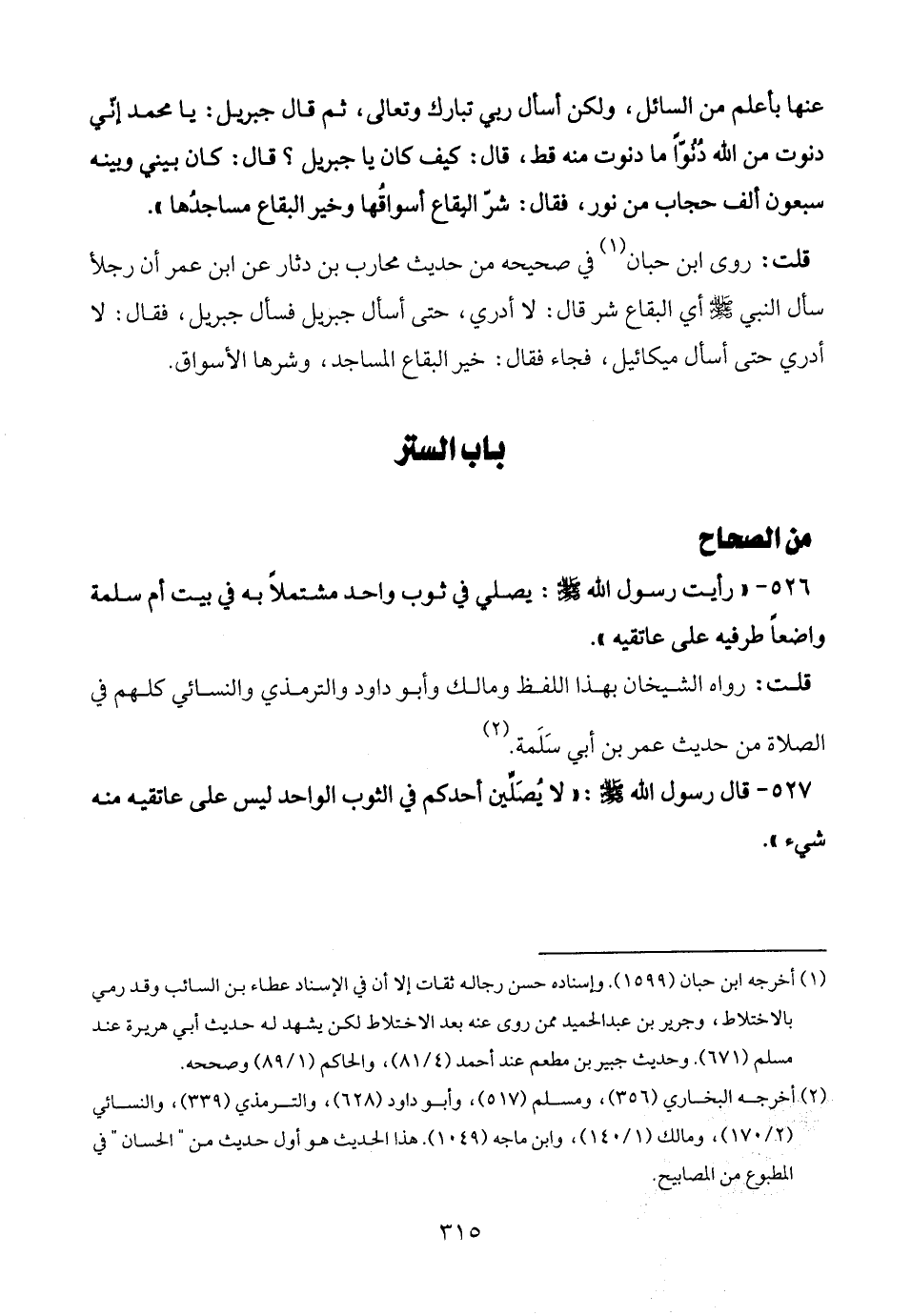526 - " رأيت رسول الله - صلى الله عليه وسلم -: يصلي في ثوب واحد مشتملًا به في بيت أم سلمة واضعًا طرفيه على عاتقيه".