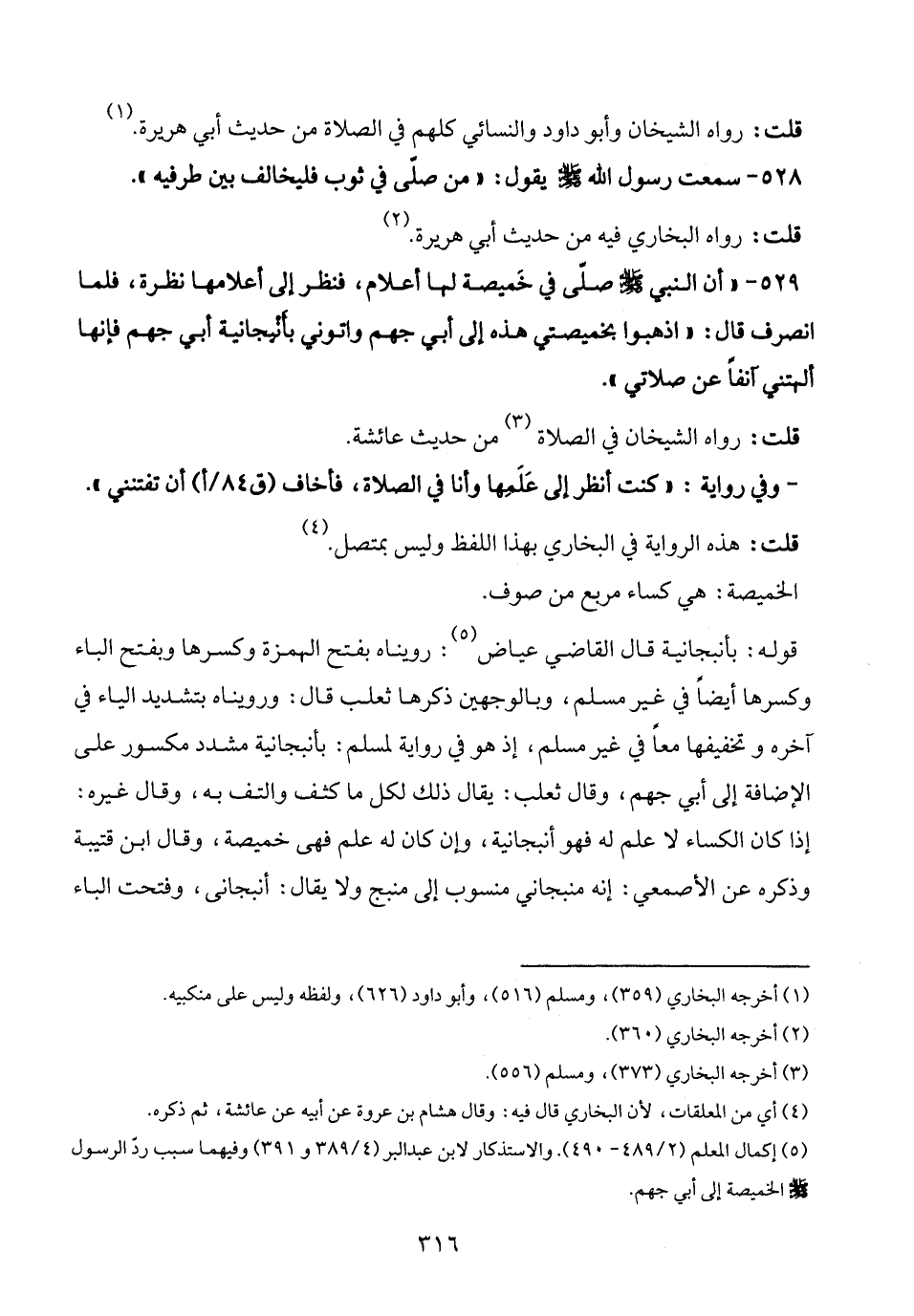 529 - "أن النبي - صلى الله عليه وسلم - صلّى في خميصة لها أعلام، فنظر إلى أعلامها نظرة، فلما انصرف قال: "اذهبوا بخميصتي هذه إلى أبي جهم واتوني بأَنْبجانية أبي جهم فإنها ألهتني آنفًا عن صلاتي".