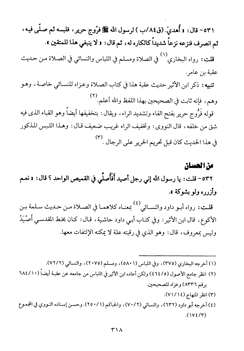 531 - قال: "أُهديَ لرسول الله - صلى الله عليه وسلم - فرّوج حرير، فلبسه ثم صلّى فيه، ثم انصرف فنزعه نزعًا شديدًا كالكاره له، ثم قال: "لا ينبغي هذا للمتقين".