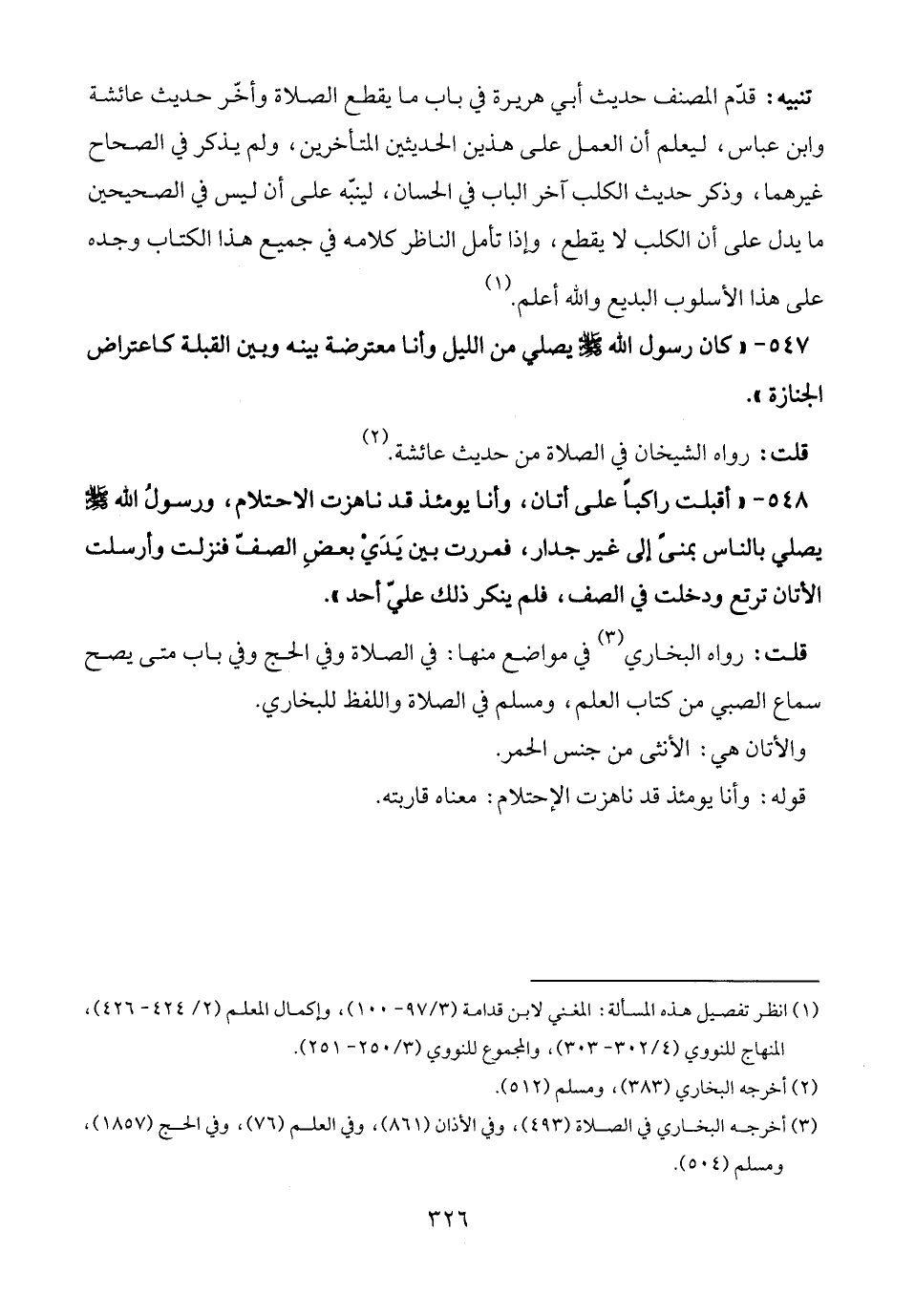تنبيه: قدّم المصنف حديث أبي هريرة في باب ما يقطع الصلاة وأخّر حديث عائشة وابن عباس، ليعلم أن العمل على هذين الحديثين المتأخرين، ولم يذكر في الصحاح غيرهما، وذكر حديث الكلب آخر الباب في الحسان، لينّبه على أن ليس في الصحيحين ما يدل على أن الكلب لا يقطع، وإذا تأمل الناظر كلامه في جميع هذا الكتاب وجده على هذا الأسلوب البديع والله أعلم. (¬1)