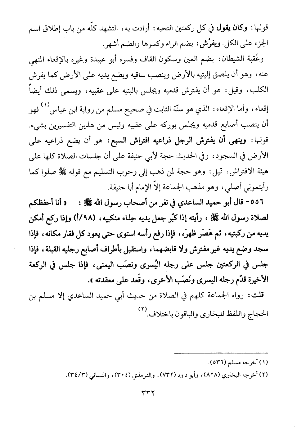 556 - قال أبو حميد الساعدي في نفر من أصحاب رسول الله - صلى الله عليه وسلم -: "أنا أحفظكم لصلاة رسول الله - صلى الله عليه وسلم -، رأيته إذا كبّر جعل يديه حِذاء منكبيه، (98 / أ) وإذا ركع أمكن يديه من ركبتيه، ثم هَصَر ظهرَه، فإذا رفع رأسه استوى حتى يعود كل فقار مكانه، فإذا سجد وضع يديه غير مفترش ولا قابضهما، واستقبل بأطراف أصابع رجليه القبلة، فإذا جلس في الركعتين جلس على رجله اليُسرى ونصَب اليمنى، فإذا جلس في الركعة الأخيرة قدّم رجله اليسرى ونَصَب الأخرى، وقَعد على معقدته".