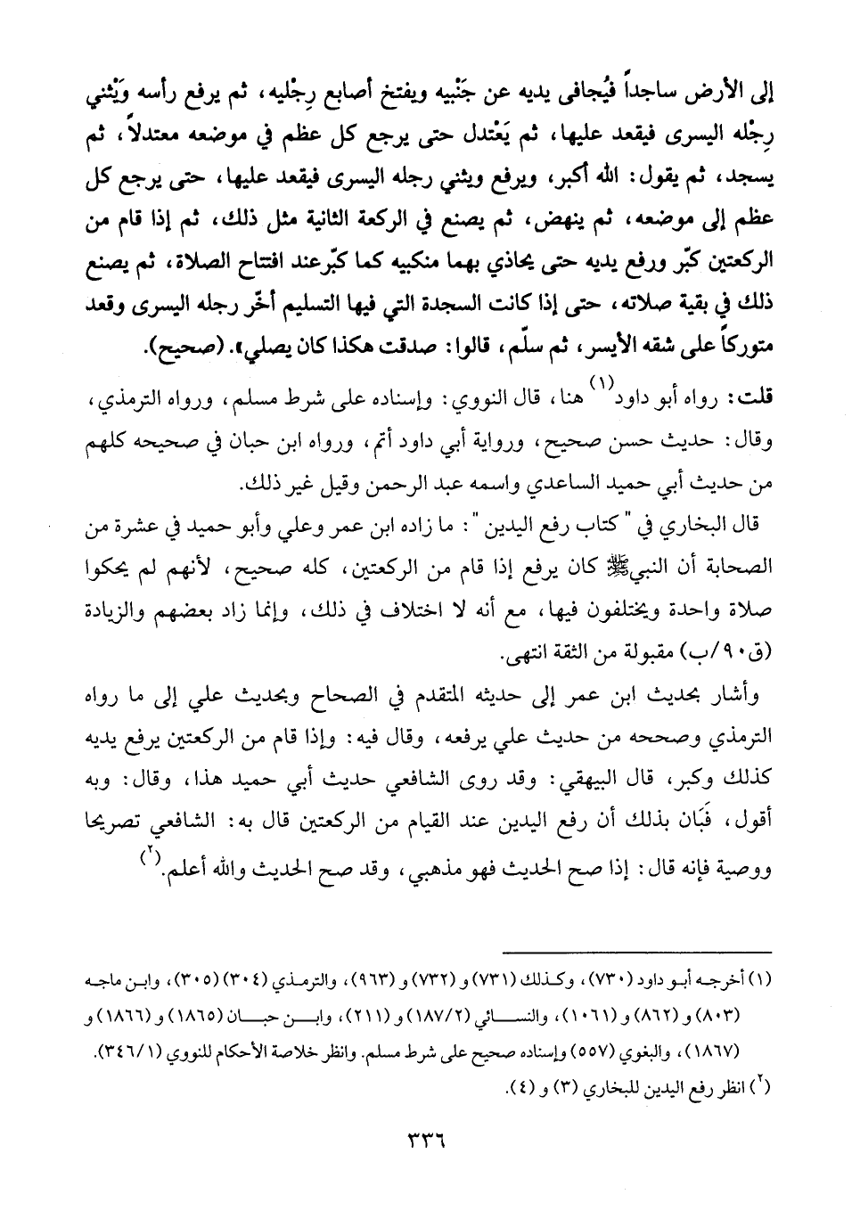 وأشار بحديث ابن عمر إلى حديثه المتقدم في الصحاح وبحديث علي إلى ما رواه الترمذي وصححه من حديث علي يرفعه، وقال فيه: وإذا قام من الركعتين يرفع يديه كذلك وكبر، قال البيهقي: وقد روى الشافعي حديث أبي حميد هذا، وقال: وبه أقول، فَبَان بذلك أن رفع اليدين عند القيام من الركعتين قال به: الشافعي تصريحا ووصية فإنه قال: إذا صح الحديث فهو مذهبي، وقد صح الحديث والله أعلم. (¬2)