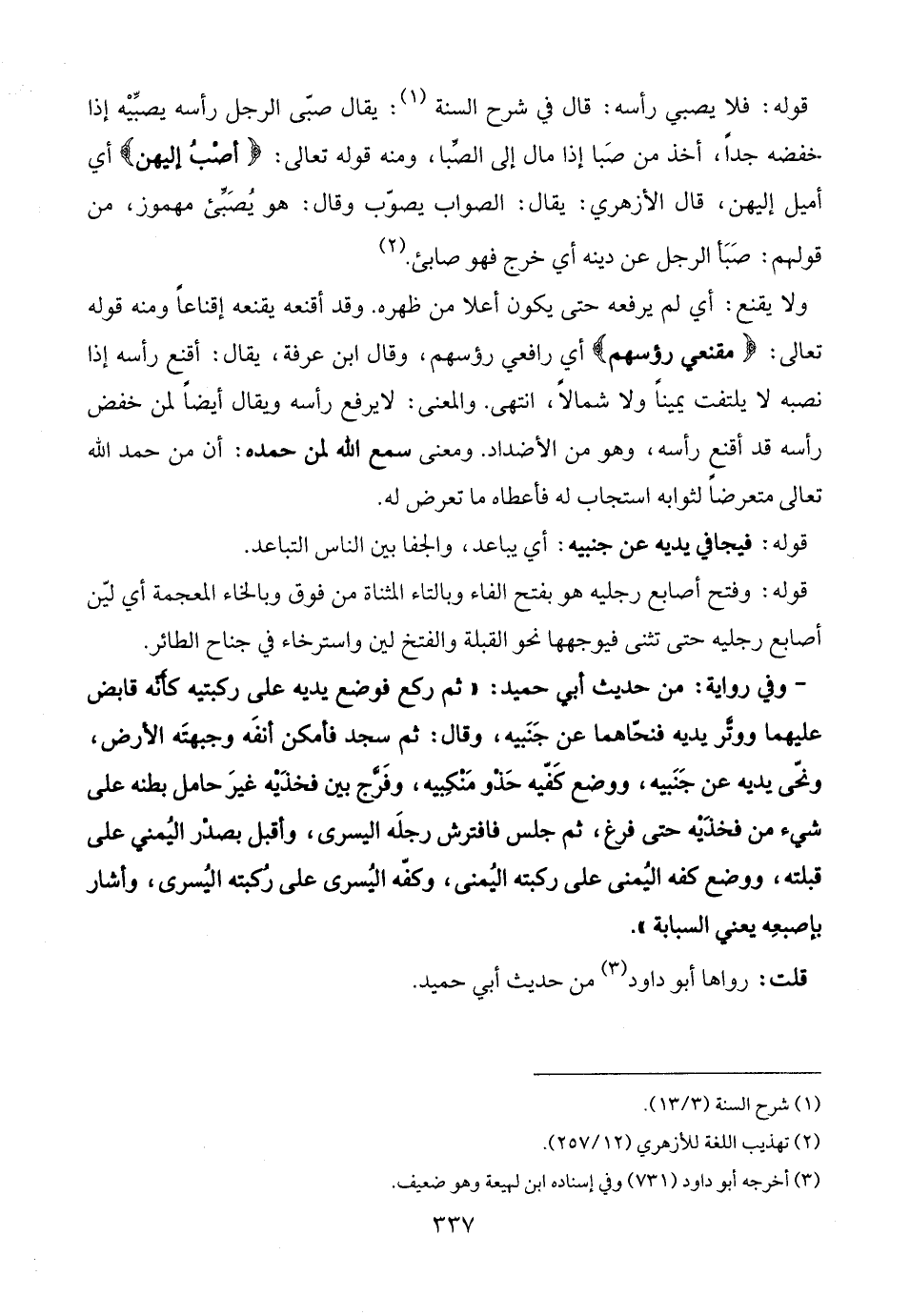 قوله: فلا يصبي رأسه: قال في شرح السنة (¬1): يقال صبّى الرجل رأسه يصبِّيْه إذا خفضه جدًّا، أخذ من صَبا إذا مال إلى الصبَّا، ومنه قوله تعالى: {أصْبُ إليهن} أي أميل إليهن، قال الأزهري: يقال: الصواب يصوّب وقال: هو يُصَبِّئ مهموز، من قولهم: صَبَأ الرجل عن دينه أي خرج فهو صابئ. (¬2)