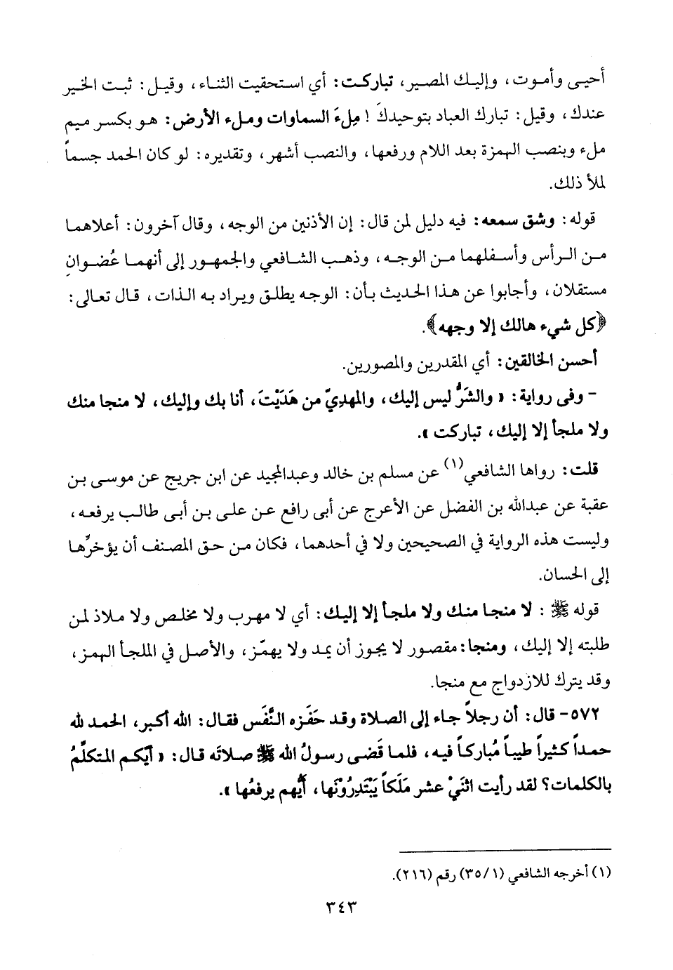 - وفي رواية: "والشَرُّ ليس إليك، والمهدِيّ من هَدَيْتَ، أنا بك وإليك، لا منجا منك ولا ملجأ إلا إليك، تباركت".