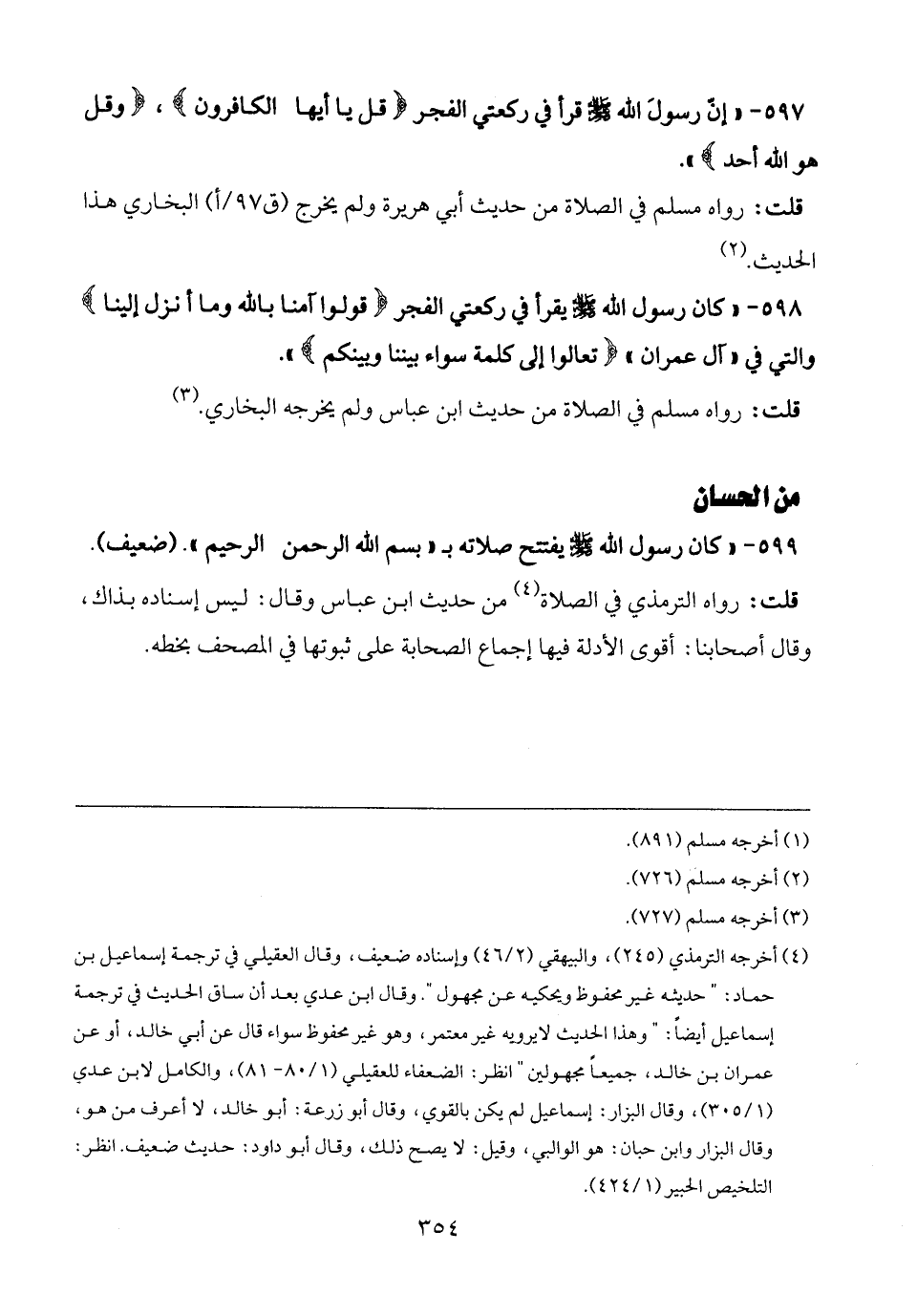 599 - " كان رسول الله - صلى الله عليه وسلم - يفتتح صلاته بـ {بِسْمِ اللَّهِ الرَّحْمَنِ الرَّحِيم} ". (ضعيف).