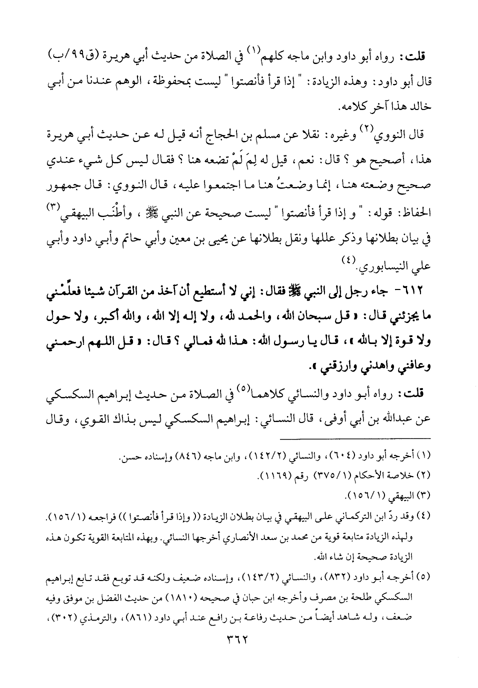 (¬5) أخرجه أبو داود (832)، والنسائي (2/ 143)، وإسناده ضعيف ولكنه قد توبع فقد تابع إبراهيم السكسكي طلحة بن مصرف وأخرجه ابن حبان في صحيحه (1810) من حديث الفضل بن موفق وفيه ضعف، وله شاهد أيضًا من حديث رفاعة بن رافع عند أبي داود (861)، والترمذي (302)، =