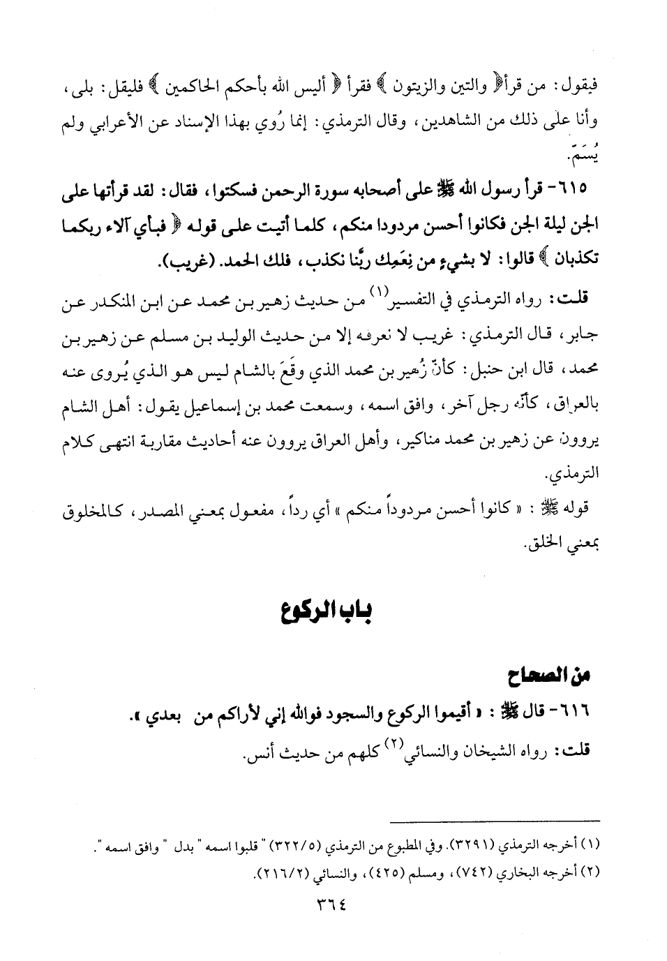 615 - قرأ رسول الله - صلى الله عليه وسلم - على أصحابه سورة الرحمن فسكتوا، فقال: لقد قرأتها على الجن ليلة الجن فكانوا أحسن مردودا منكم، كلما أتيت على قوله {فَبِأَيِّ آلَاءِ رَبِّكُمَا تُكَذِّبانِ} قالوا: لا بشيءٍ من نِعَمِك ربَّنا نكذب، فلك الحمد. (غريب).