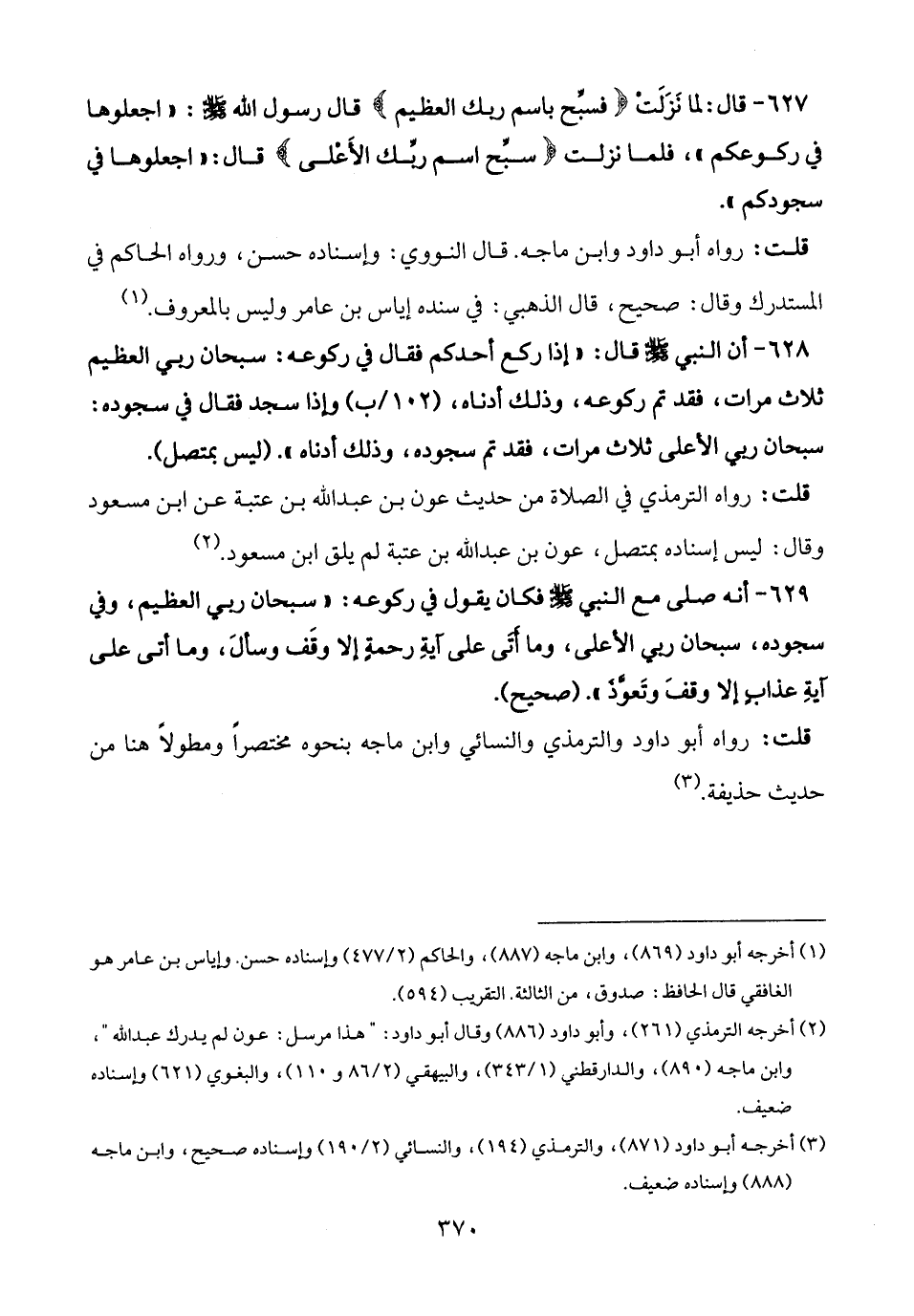 627 - قال: لما نَزَلَتْ {فَسَبِّحْ بِاسْمِ رَبِّكَ الْعَظِيمِ} قال رسول الله - صلى الله عليه وسلم -: "اجعلوها في ركوعكم"، فلما نزلت {سَبِّحِ اسْمَ رَبِّكَ الْأَعْلَى} قال: "اجعلوها في سجودكم".