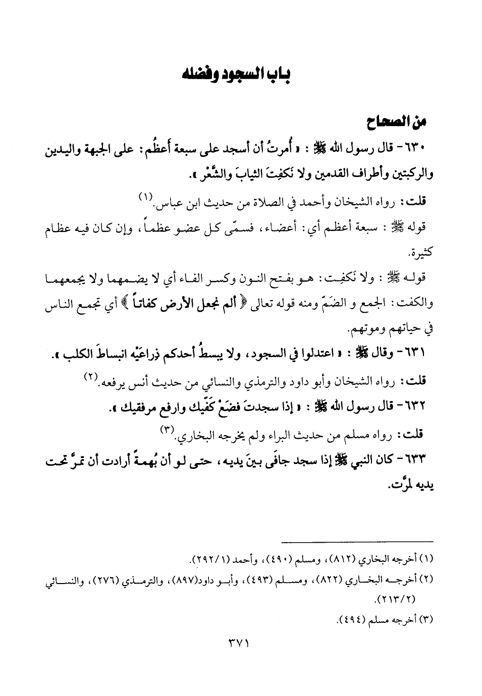 630 - قال رسول الله - صلى الله عليه وسلم -: "أُمرتُ أن أسجد على سبعة أعظُم: على الجبهة واليدين والركبتين وأطراف القدمين ولا نَكفِتَ الثيابَ والشَّعْر".
