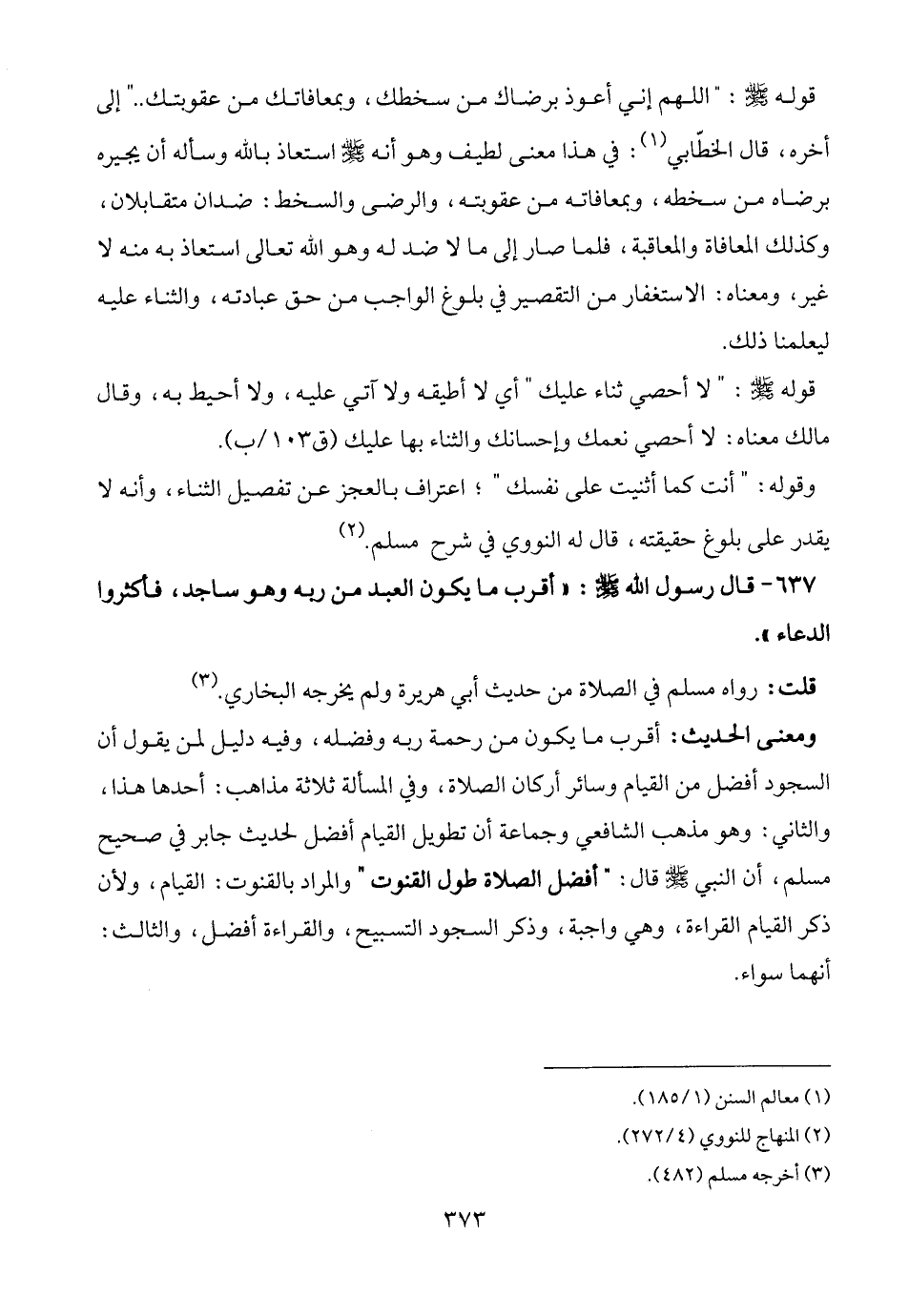 ومعنى الحديث: أقرب ما يكون من رحمة ربه وفضله، وفيه دليل لمن يقول أن السجود أفضل من القيام وسائر أركان الصلاة، وفي المسألة ثلاثة مذاهب: أحدها هذا، والثاني: وهو مذهب الشافعي وجماعة أن تطويل القيام أفضل لحديث جابر في صحيح مسلم، أن النبي - صلى الله عليه وسلم - قال: "أفضل الصلاة طول القنوت" والمراد بالقنوت: القيام، ولأن ذكر القيام القراءة، وهي واجبة، وذكر السجود التسبيح، والقراءة أفضل، والثالث: أنهما سواء.