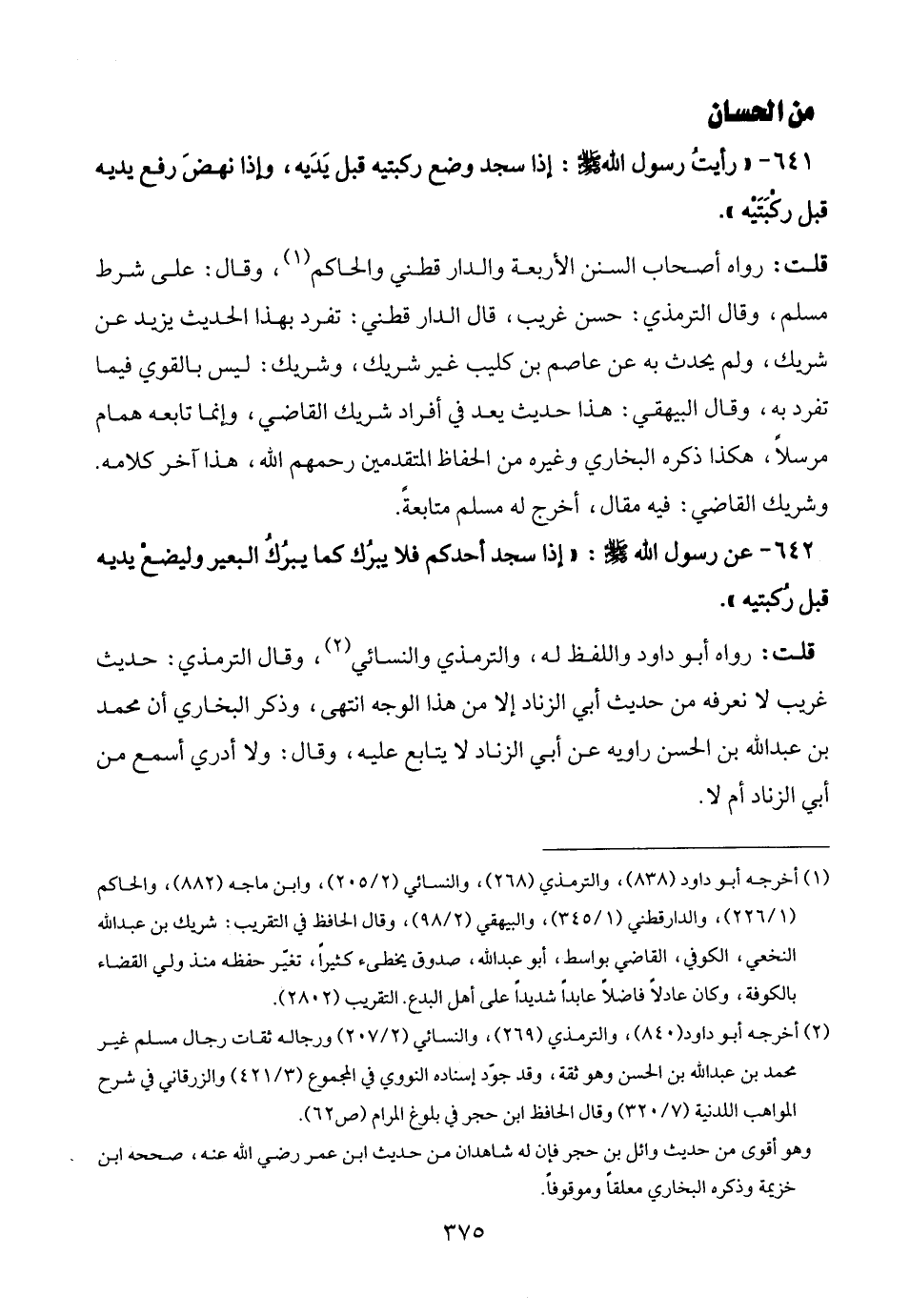 641 - " رأيتُ رسول الله - صلى الله عليه وسلم -: إذا سجد وضع ركبتيه قبل يَدَيه، وإذا نهضَ رفع يديه قبل ركْبَتَيْه".