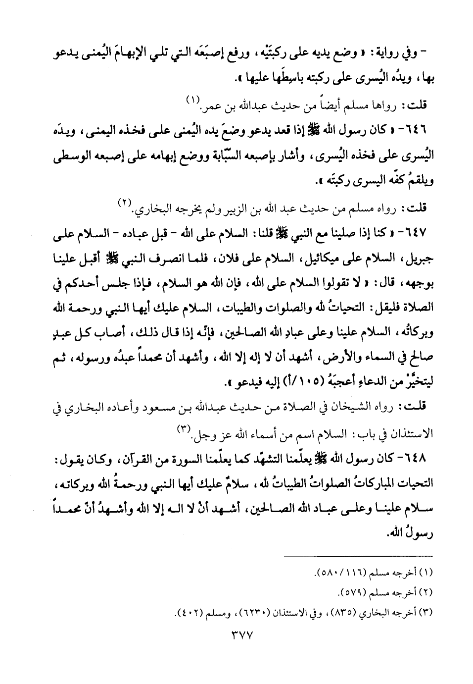 646 - "كان رسول الله - صلى الله عليه وسلم - إذا قعد يدعو وضعَ يده اليُمنى على فخذه اليمنى، ويدَه اليُسرى على فخذه اليُسرى، وأشار بإصبعه السّبّابة ووضع إبهامه على إصبعه الوسطى ويلقمُ كفّه اليسرى ركبتَه".
