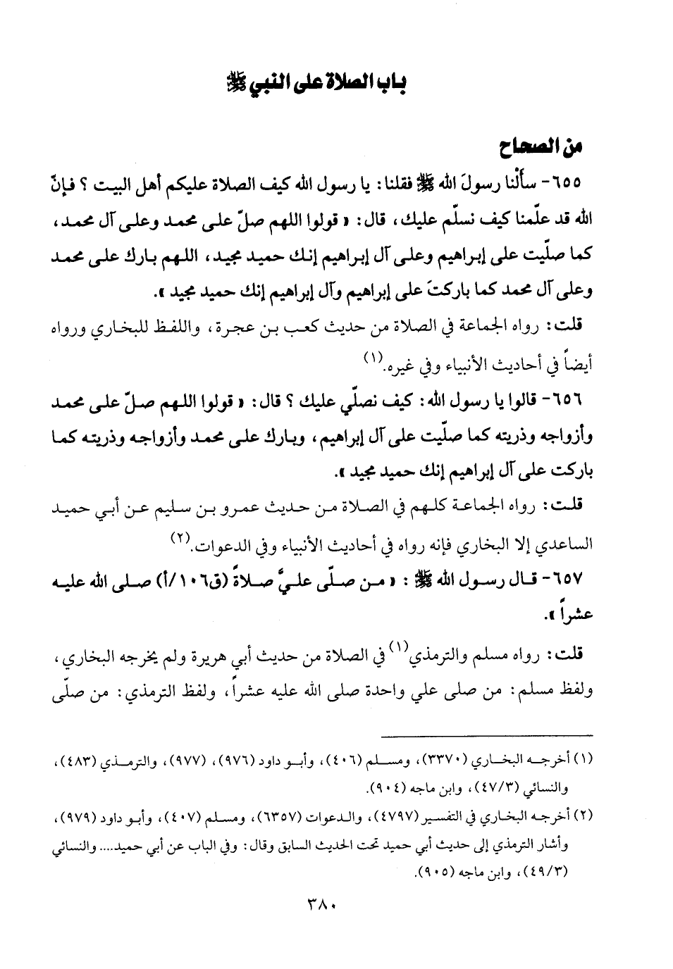 655 - سأَلْنا رسولَ الله - صلى الله عليه وسلم - فقلنا: يا رسول الله كيف الصلاة عليكم أهل البيت؟ فإنّ الله قد علّمنا كيف نسلّم عليك، قال: "قولوا اللهم صلّ على محمد وعلى آل محمد، كما صلّيت على ابراهيم وعلى آل ابراهيم إنك حميد مجيد، اللهم بارك على محمد وعلى آل محمد كما باركتَ على إبراهيم وآل ابراهيم إنك حميد مجيد".