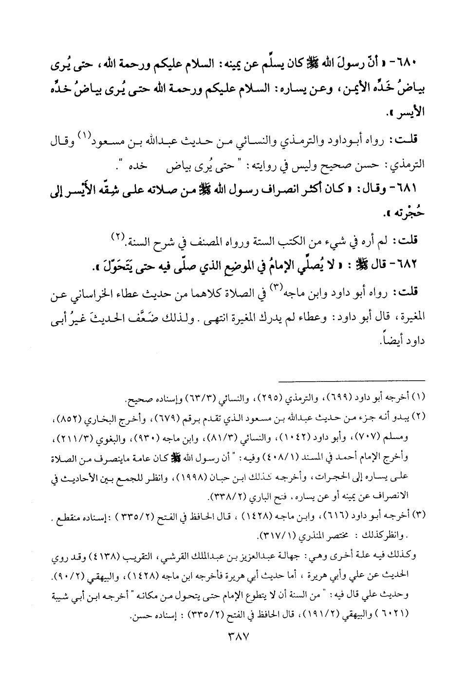 680 - "أن رسولَ الله - صلى الله عليه وسلم - كان يسلِّم عن يمينه: السلام عليكم ورحمة الله، حتى يُرى بياضُ خَدِّه الأيمن، وعن يساره: السلام عليكم ورحمة الله حتى يُرى بياضُ خدِّه الأيسر".