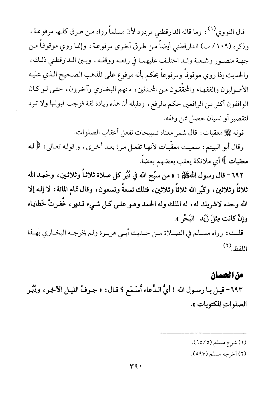 قال النووي (¬1): وما قاله الدارقطني مردود لأن مسلمًا رواه من طرق كلها مرفوعة، وذكره الدارقطني أيضًا من طرق أخرى مرفوعة، وإنما روي موقوفًا من جهة منصور وشعبة وقد اختلف عليهما في رفعه ووقفه، وبين الدارقطني ذلك، والحديث إذا روي موقوفًا ومرفوعًا يحكم بأنه مرفوع على المذهب الصحيح الذي عليه الأصوليون والفقهاء والمحقِّقون من المحدثين، منهم البخاري وآخرون، حتى لو كان الواقفون أكثر من الرافعين حكم بالرفع، ودليله أن هذه زيادة ثقة فوجب قبولها ولا ترد لتقصير أو نسيان حصل ممن وقفه.