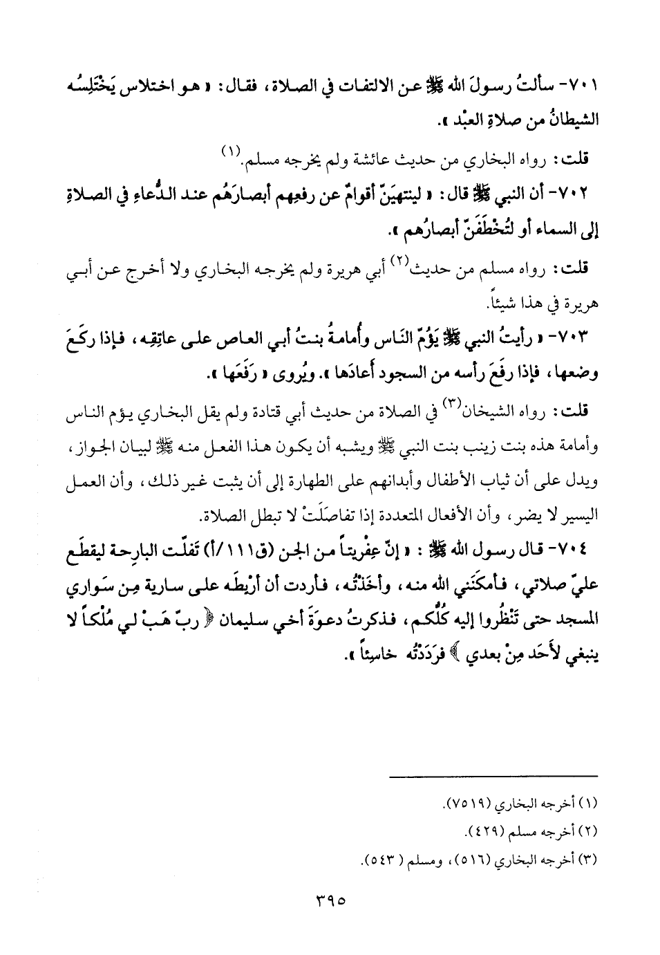703 - "رأيتُ النبي - صلى الله عليه وسلم - يَؤُمّ النَاس وأُمامةُ بنتُ أبي العاص على عاتِقِه، فإذا ركَعَ وضعها، فإذا رفَعَ رأسه من السجود أَعادَها". ويُروى "رَفَعَها".