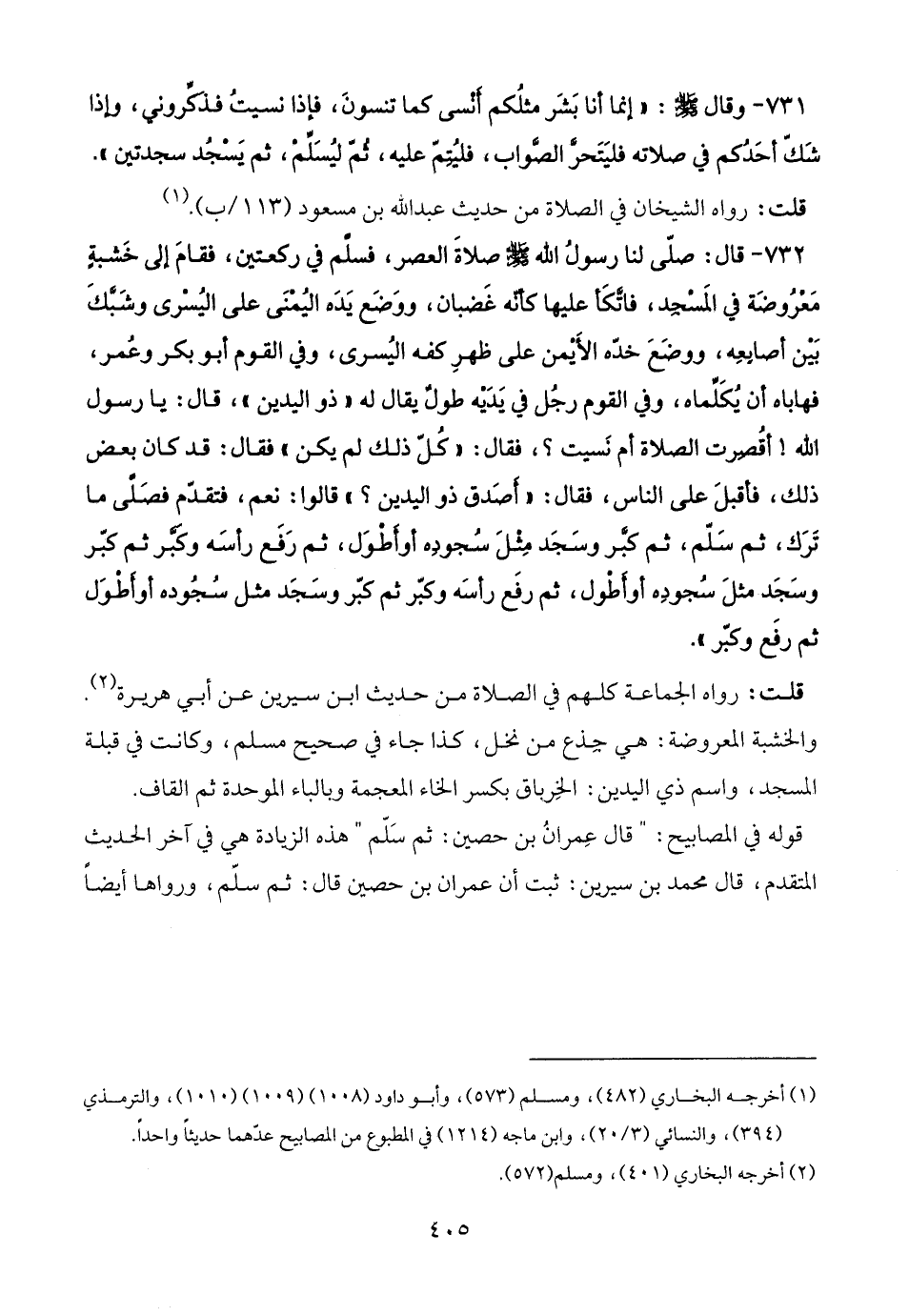 732 - قال: صلّى لنا رسولُ الله - صلى الله عليه وسلم - صلاةَ العصر، فسلَّم في ركعتين، فقامَ إلى خَشبةٍ مَعْرُوضَة في المَسْجِد، فاتَّكأ عليها كأنّه غَضبان، ووَضَع يَدَه اليُمْنَى على اليُسْرى وشَبَّكَ بَيْن أصابعِه، ووضَعَ خدّه الأَيْمن على ظهرِ كفه اليُسرى، وفي القوم أبو بكر وعُمر، فهاباه أن يُكَلِّماه، وفي القوم رجُل في يَدَيْه طولٌ يقال له "ذو اليدين"، قال: يا رسول الله! أقُصِرت الصلاة أم نَسيت؟، فقال: "كُلّ ذلك لم يكن" فقال: قد كان بعض ذلك، فأقبلَ على الناس، فقال: "أصَدق ذو اليدين؟ " قالوا: نعم، فتقدّم فصَلَّى ما تَرَك، ثم سَلّم، ثم كبَّر وسَجَد مِثْلَ سجودِه أو أَطوَل، ثم رَفَع رأسَه وكَبَّر ثم كبّر وسَجَد مثلَ سُجودِه أو أطْول، ثم رفَع رأسَه وكبّر ثم كبّر وسَجَد مثل سُجُوده أو أطْوَل ثم رفَع وكبّر".
