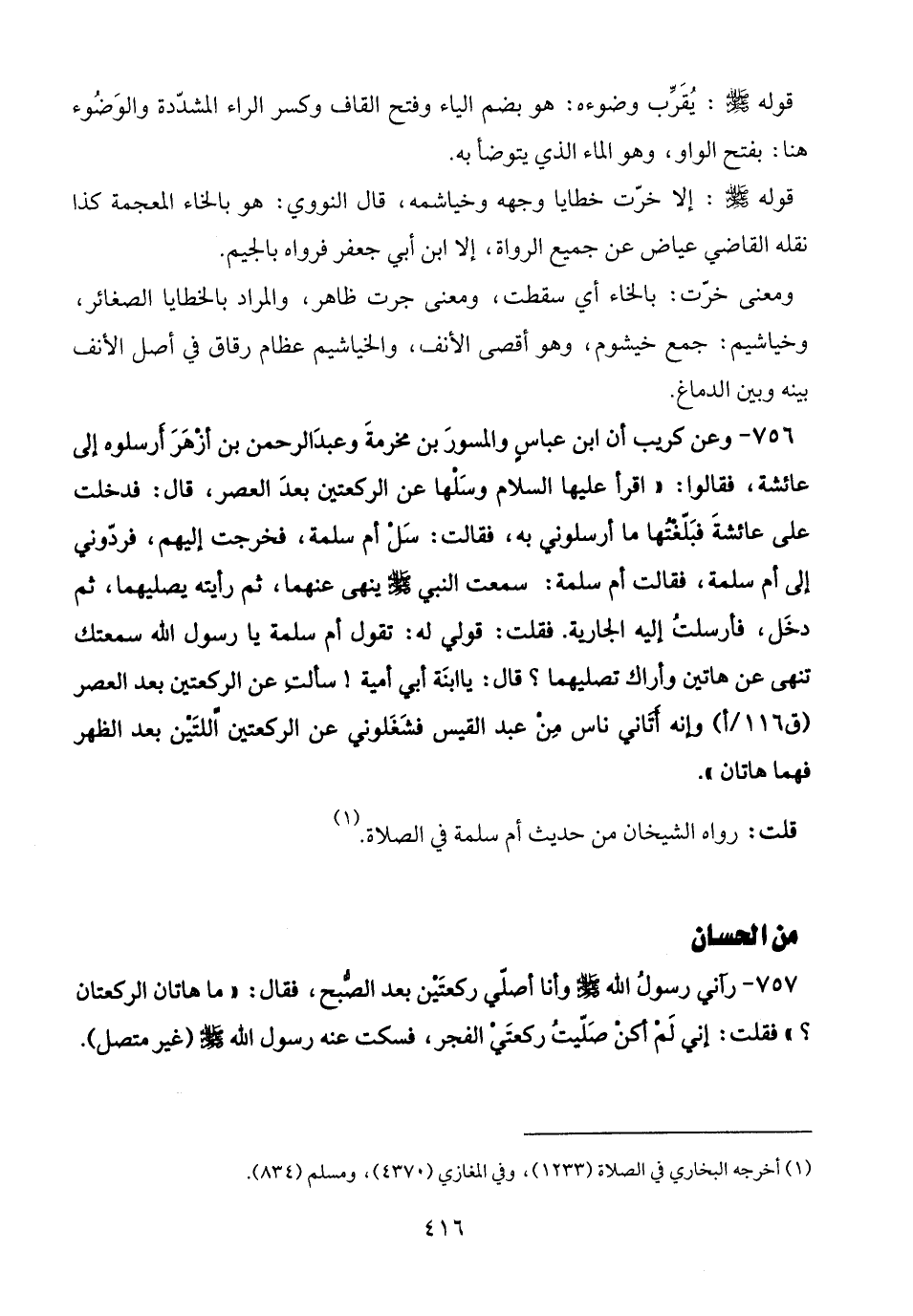 756 - وعن كريب أن ابن عباس والمسورَ بن مخرمةَ وعبدَ الرحمن بن أزْهَرَ أَرسلوه إلى عائشة، فقالوا: "اقرأ عليها السلام وسَلْها عن الركعتين بعدَ العصر، قال: فدخلت على عائشةَ فبَلّغْتُها ما أرسلوني به، فقالت: سَلْ أم سلمة، فخرجت إليهم، فردّوني إلى أم سلمة، فقالت أم سلمة: سمعت النبي - صلى الله عليه وسلم - ينهى عنهما، ثم رأيته يصليهما، ثم دخَل، فأرسلتُ إليه الجارية. فقلت: قولي له: تقول أم سلمة يا رسول الله سمعتك تنهى عن هاتين وأراك تصليهما؟ قال: يا ابنَة أبي أمية! سألتِ عن الركعتين بعد العصر وإنه أتاني ناس مِنْ عبد القيس فشَغَلوني عن الركعتين الّلتَين بعد الظهر فهما هاتان".