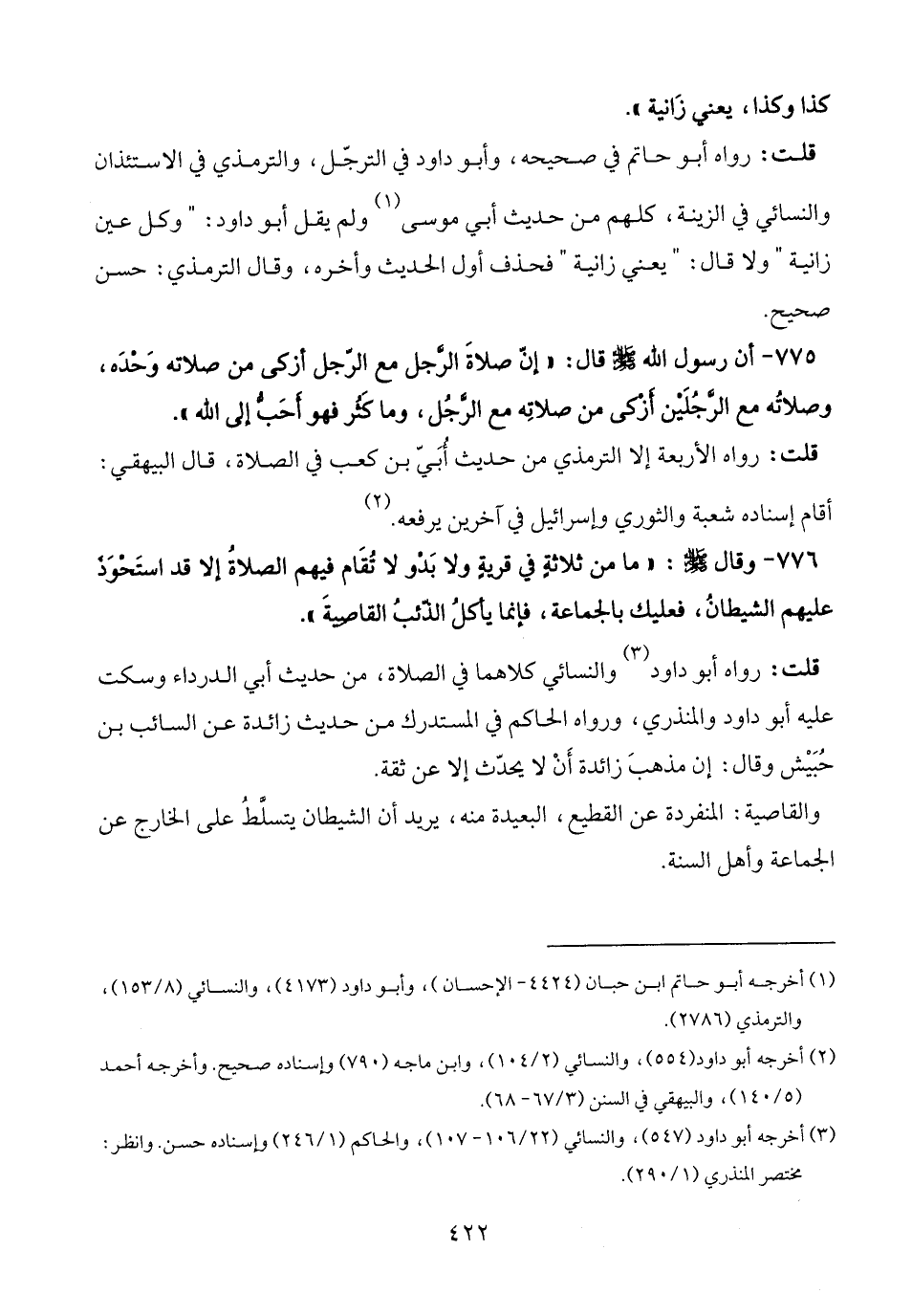 776 - وقال - صلى الله عليه وسلم -: "ما من ثلاثة في قريةٍ ولا بَدْو لا تُقَام فيهم الصلاةُ إلا قد استَحْوَذ عليهم الشيطانُ، فعليك بالجماعة، فإنما يأكلُ الذّئبُ القاصيةَ".